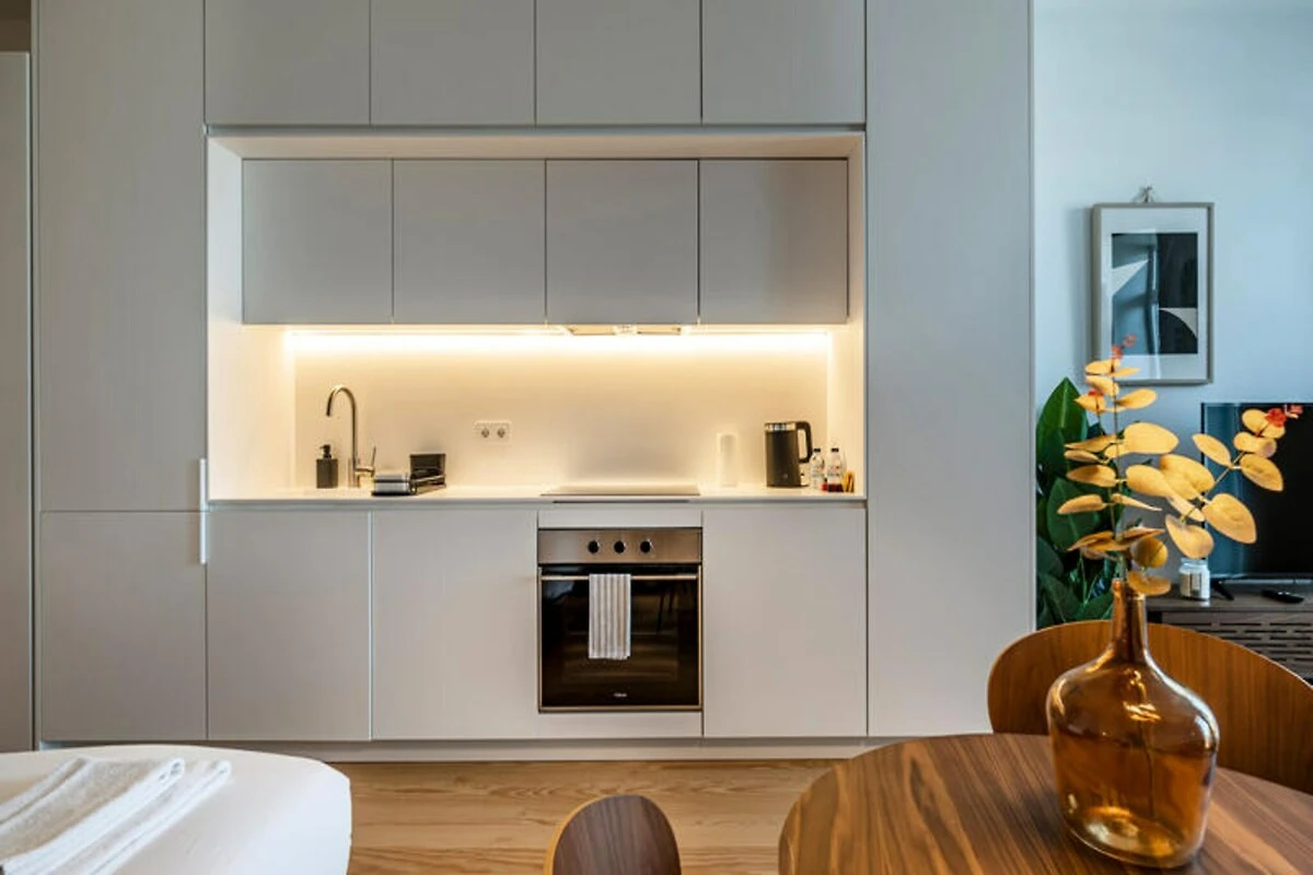 Dieses kürzlich erbaute, 55 m² große Studio ist durchdacht gestaltet und bietet sowohl Komfort als auch Funktionalität. Der offene Grundriss verfügt über eine voll ausgestattete elektrische Küche mit modernen Geräten wie Kühlschrank, Backofen, Geschirrspüler und Kaffeemaschine, sodass Sie ganz einfach Ihre Lieblingsgerichte zubereiten können. Entspannen Sie sich im klimatisierten Wohnbereich, genießen Sie Satellitenfernsehen mit mehreren Sprachoptionen oder bleiben Sie mit Highspeed-WLAN in Verbindung. Zusätzliche Annehmlichkeiten wie eine Waschmaschine, ein Bügeleisen und ein Haartrockner sorgen für einen stressfreien Aufenthalt, während der Aufzug Ihre Stadterkundungen noch bequemer macht.
