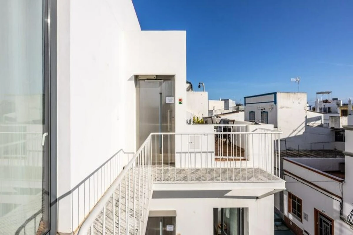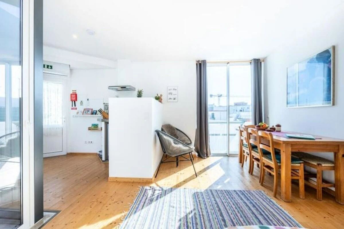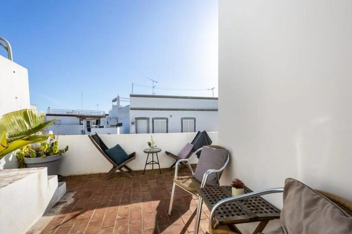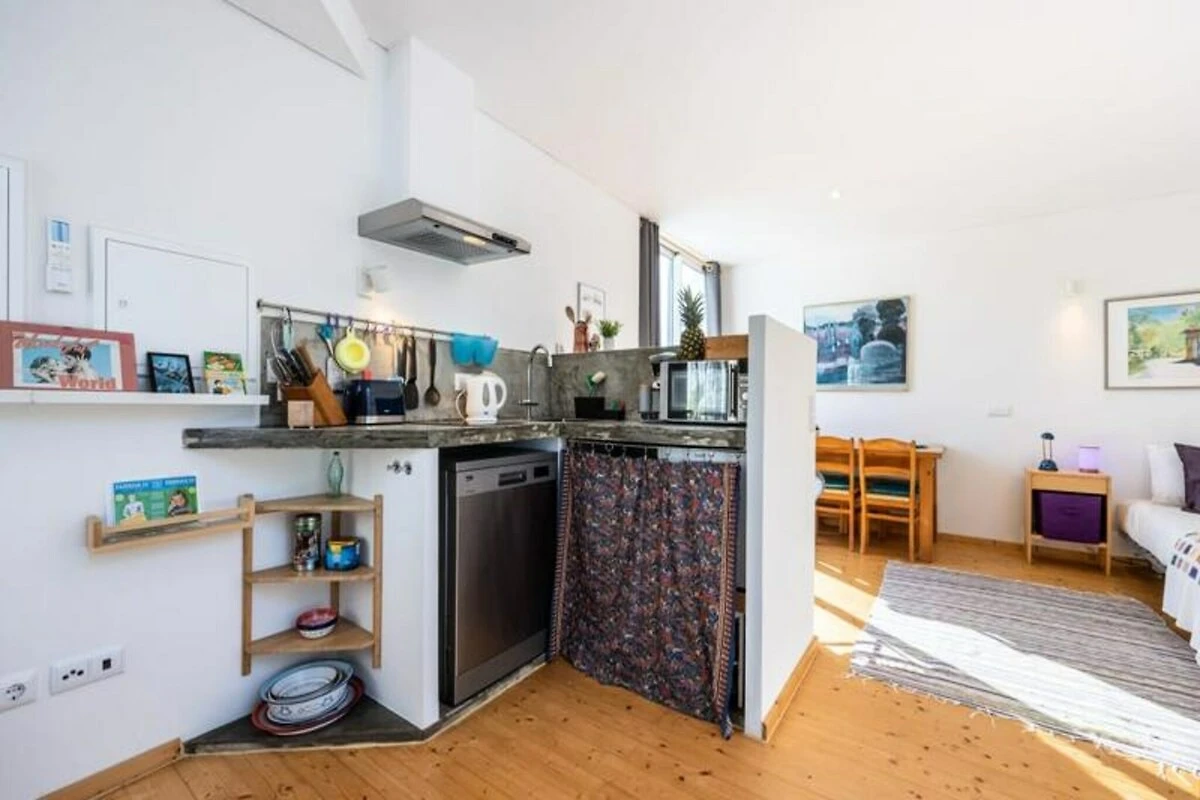 Im Inneren ist das Studio durchdacht gestaltet und verfügt über eine gut ausgestattete Küchenzeile mit einem Induktionskochfeld mit zwei Kochplatten, Mikrowelle, Kühlschrank und Geschirrspüler. Der Wohnbereich bietet ein bequemes Schlafsofa, Klimaanlage und WLAN für einen entspannten Aufenthalt. Große Fenster sorgen für hervorragende Belüftung, während die private Terrasse zum Sonnenbaden einlädt. Gäste haben außerdem Zugang zur gemeinschaftlichen Dachterrasse mit Panoramablick über die historischen Dächer von Olhão und das glitzernde Meer.