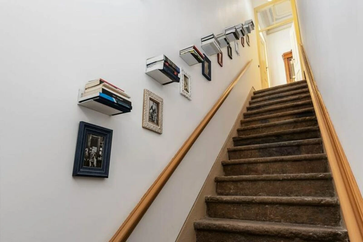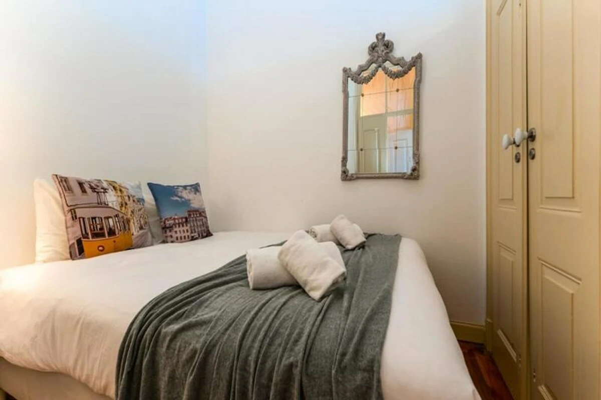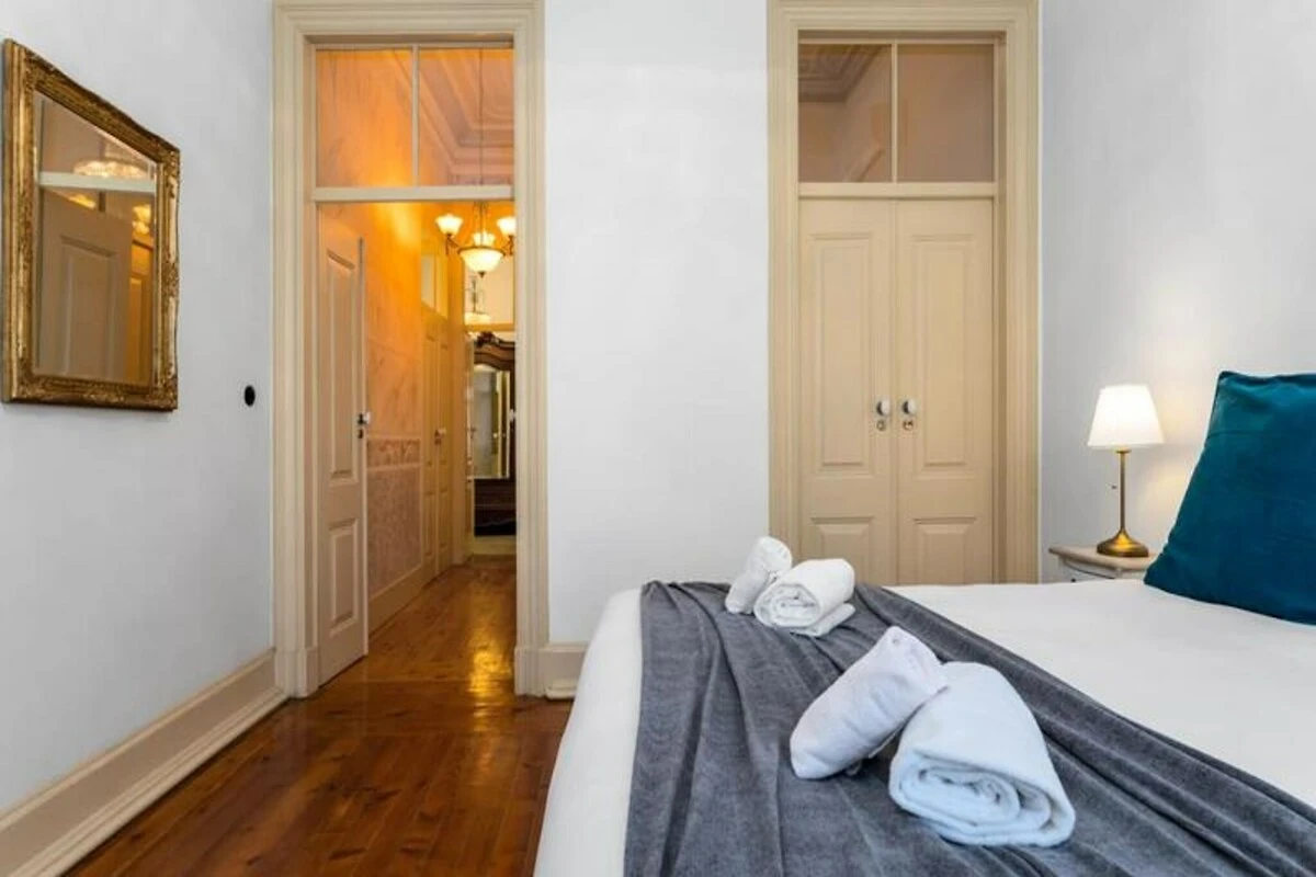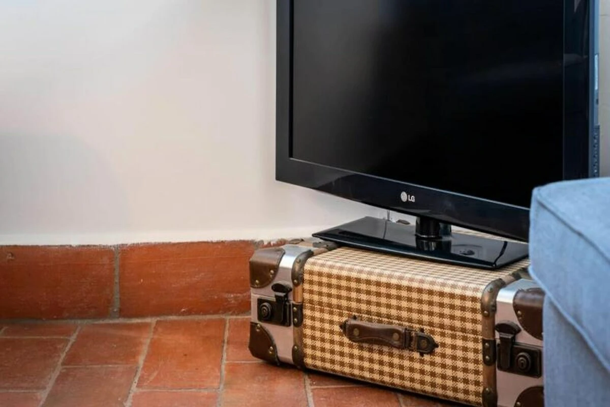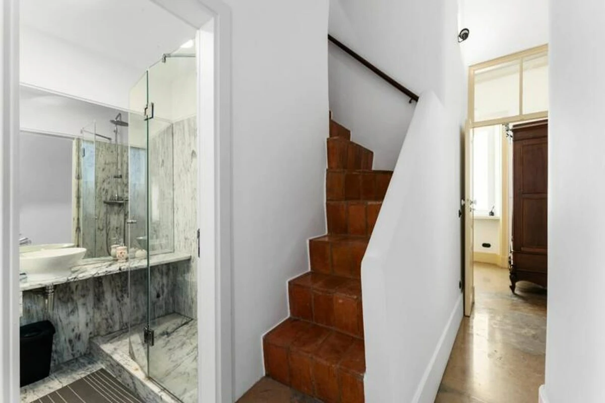 Das Apartment erstreckt sich über mehrere Ebenen und bietet eine warme und einladende Atmosphäre. Im ersten Stock befinden sich zwei geräumige Schlafzimmer, eines davon mit Flügeltüren, die auf einen charmanten Balkon und ein kleines angrenzendes Arbeitszimmer führen. Das zweite Schlafzimmer ist durch originale Holztüren nahtlos mit dem ersten verbunden und bewahrt so den historischen Charakter des Hauses. Über die schmale Steintreppe gelangen Sie in den zweiten Stock, wo ein offener Wohn- und Küchenbereich zu einer großen Außenterrasse führt – ideal für Mahlzeiten im Freien. Das absolute Highlight ist die sonnendurchflutete Dachterrasse im vierten Stock mit atemberaubendem Blick auf die Inseln Armona, Culatra und Fuzeta.
