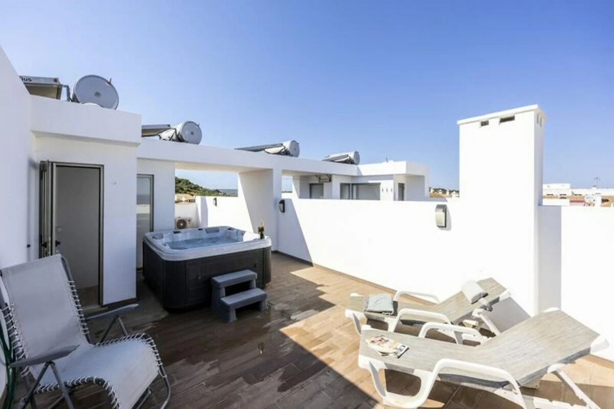Dieses Apartment im zweiten Stock, ideal für zwei Personen, besticht durch moderne Eleganz. Das helle Schlafzimmer verfügt über ein luxuriöses Kingsize-Bett, Klimaanlage und einen Fernseher. Der offene Wohnbereich mit voll ausgestatteter Küche, gemütlichem Essbereich und einer Lounge mit Zugang zu einem nach Süden ausgerichteten Balkon lädt zum Entspannen ein. Hier können Sie den atemberaubenden Meerblick genießen, grillen oder in der Sitzecke im Freien relaxen. Für ultimativen Luxus besuchen Sie Ihre private Dachterrasse mit Sonnenliegen, Essbereich und Whirlpool – perfekt, um unter dem Sternenhimmel der Algarve zu sternenklaren Tagen.