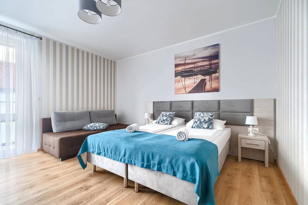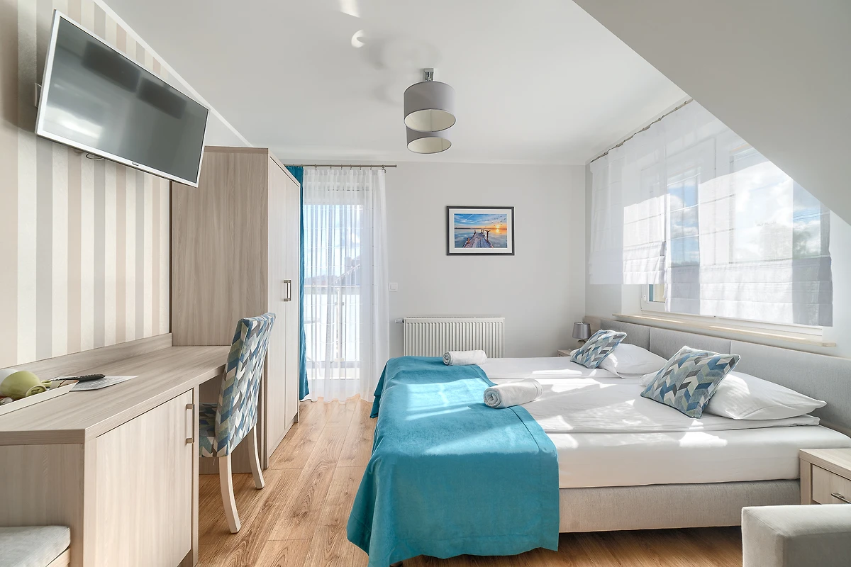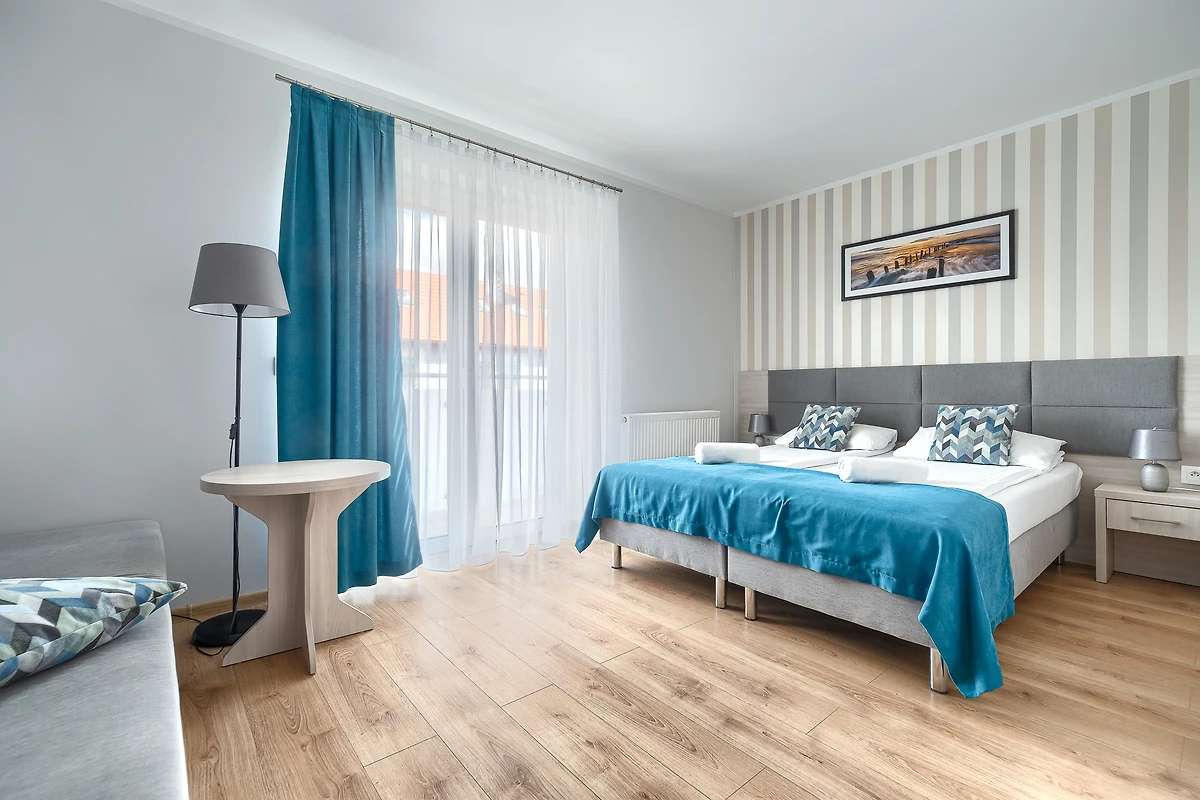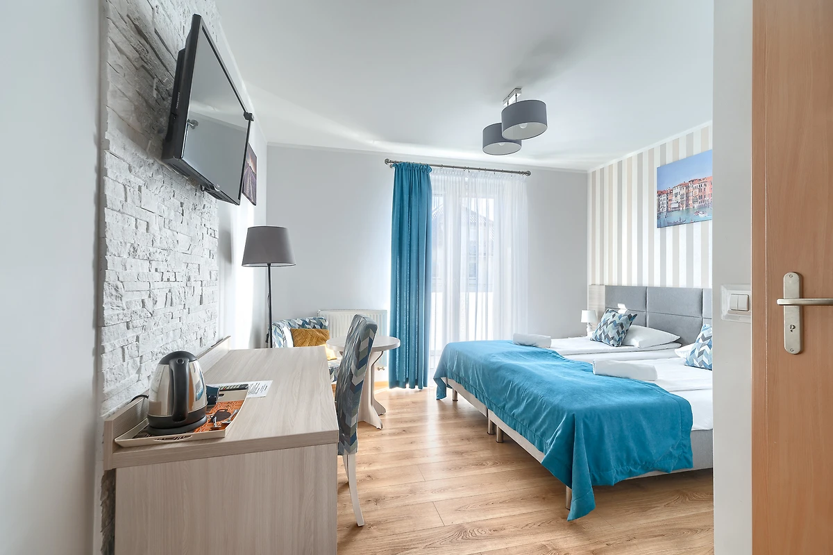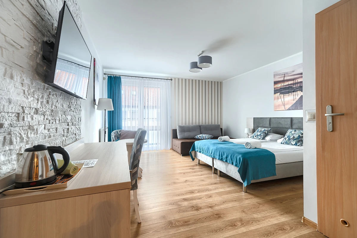 Die voll ausgestattete Küchenzeile bietet alles, was Sie für die Zubereitung Ihrer Mahlzeiten benötigen – von Kaffeemaschine und Wasserkocher bis hin zu Geschirr und Besteck. Ein geräumiger Essbereich sorgt für gemeinsame Genussmomente. Im Wohnbereich erwartet Sie ein TV für entspannte Abende. Kostenloses WLAN, Bügeleisen und Bettwäsche gehören selbstverständlich dazu. Für Ihr Fahrzeug steht ein sicherer Parkplatz zur Verfügung. Unsere Pension ist ausschließlich für Nichtraucher – so genießen Sie stets frische Luft. Die Nähe zum feinen Sandstrand und die ruhige Umgebung machen Ihren Aufenthalt besonders erholsam. Entdecken Sie Grzybowo – wir freuen uns auf Sie!