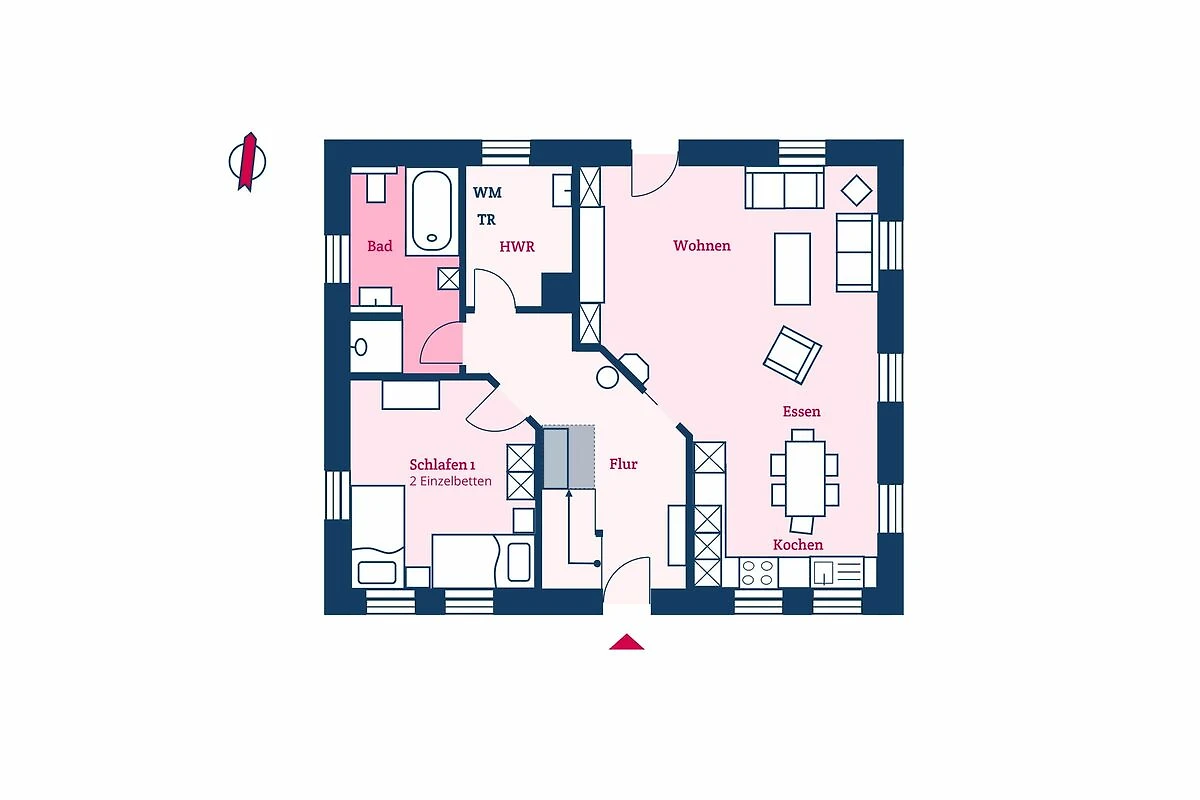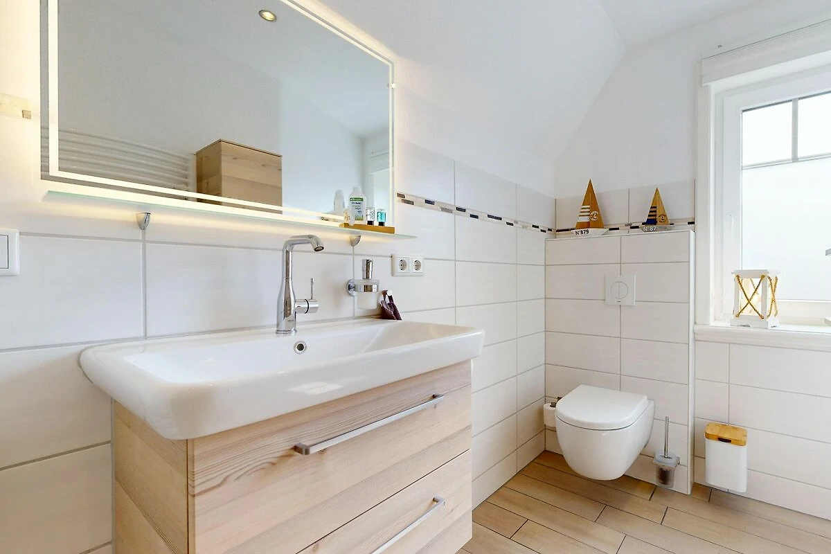 Im Erdgeschoss befinden sich ein Wohn- und Essbereich mit offener Küche, ein Schlafzimmer mit zwei Einzelbetten und ein Vollbad mit Badewanne und Raindance-Dusche, sowie ein Hauswirtschaftsraum mit Waschmaschine und Trockner. Über den Wohnbereich gelangen Sie auf die eigene Terrasse. Der Ethanol-Kamin sorgt auch an kühleren Tagen für eine angenehme Atmosphäre.