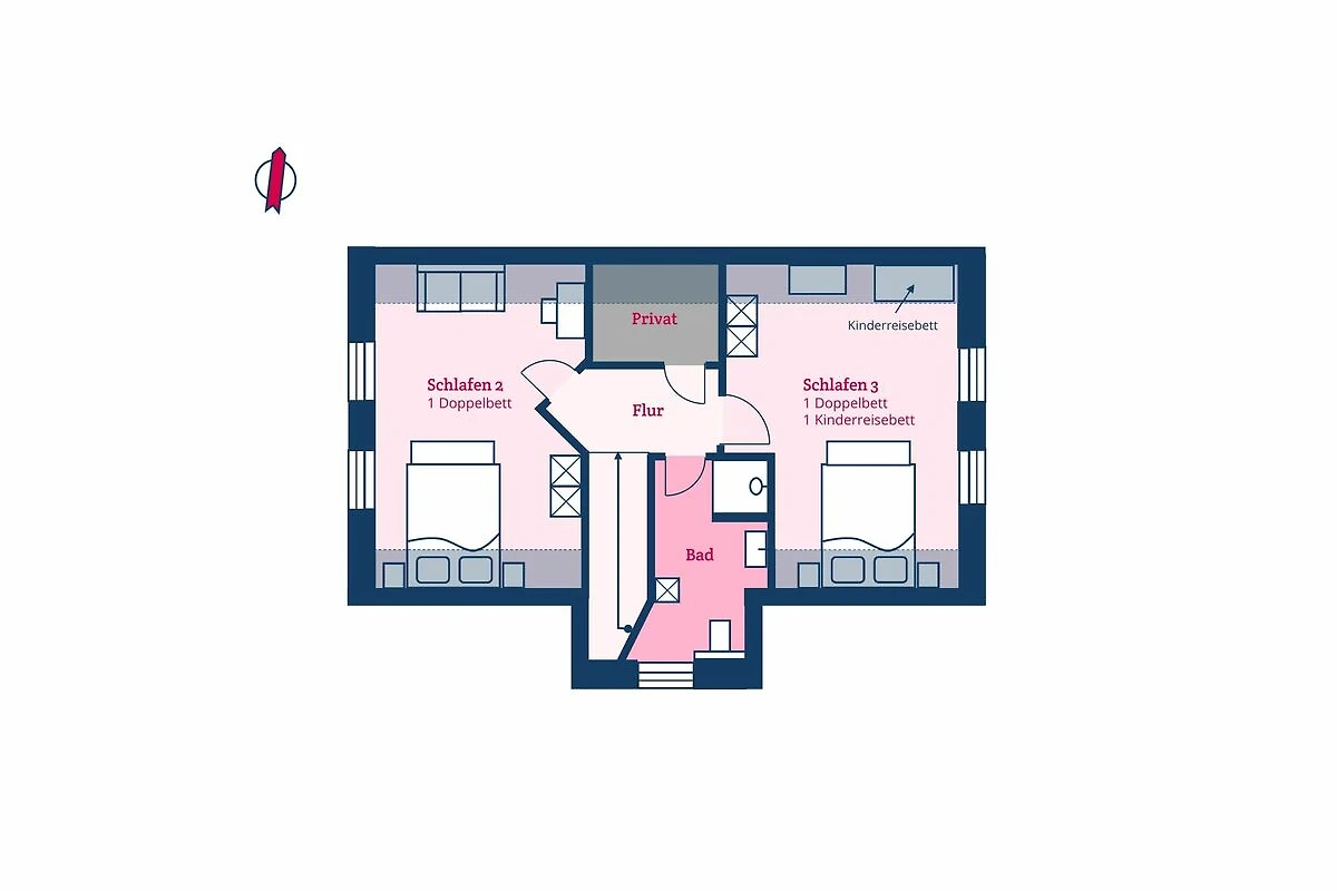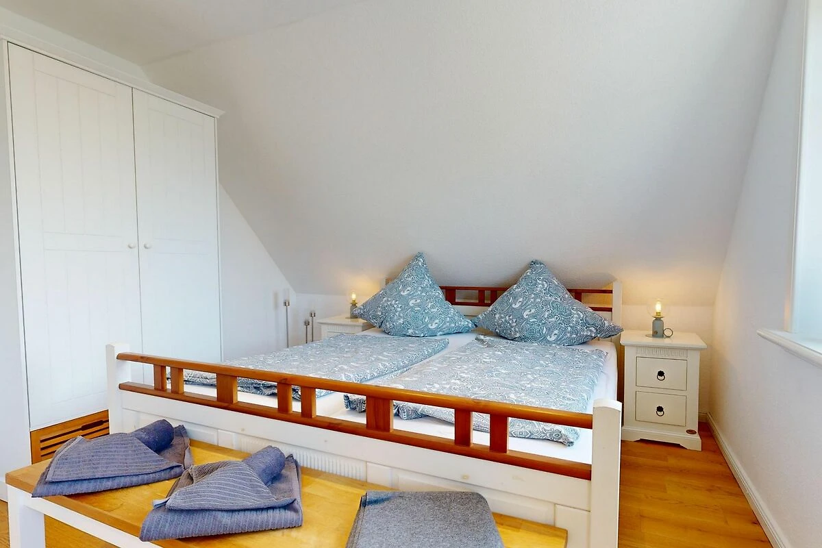 Im Obergeschoss sind zwei weitere Schlafzimmer - jeweils mit einem Doppelbett ausgestattet - sowie das zweite Duschbad gelegen. Alle Schlafzimmer sind mit einem TV ausgestattet, ein Doppelbett-Zimmer verfügt über einen Schminktisch. In beiden Bädern befinden sich Radios, die in eine Wand eingelassen sind und über den Lichtschalter bedient werden.
