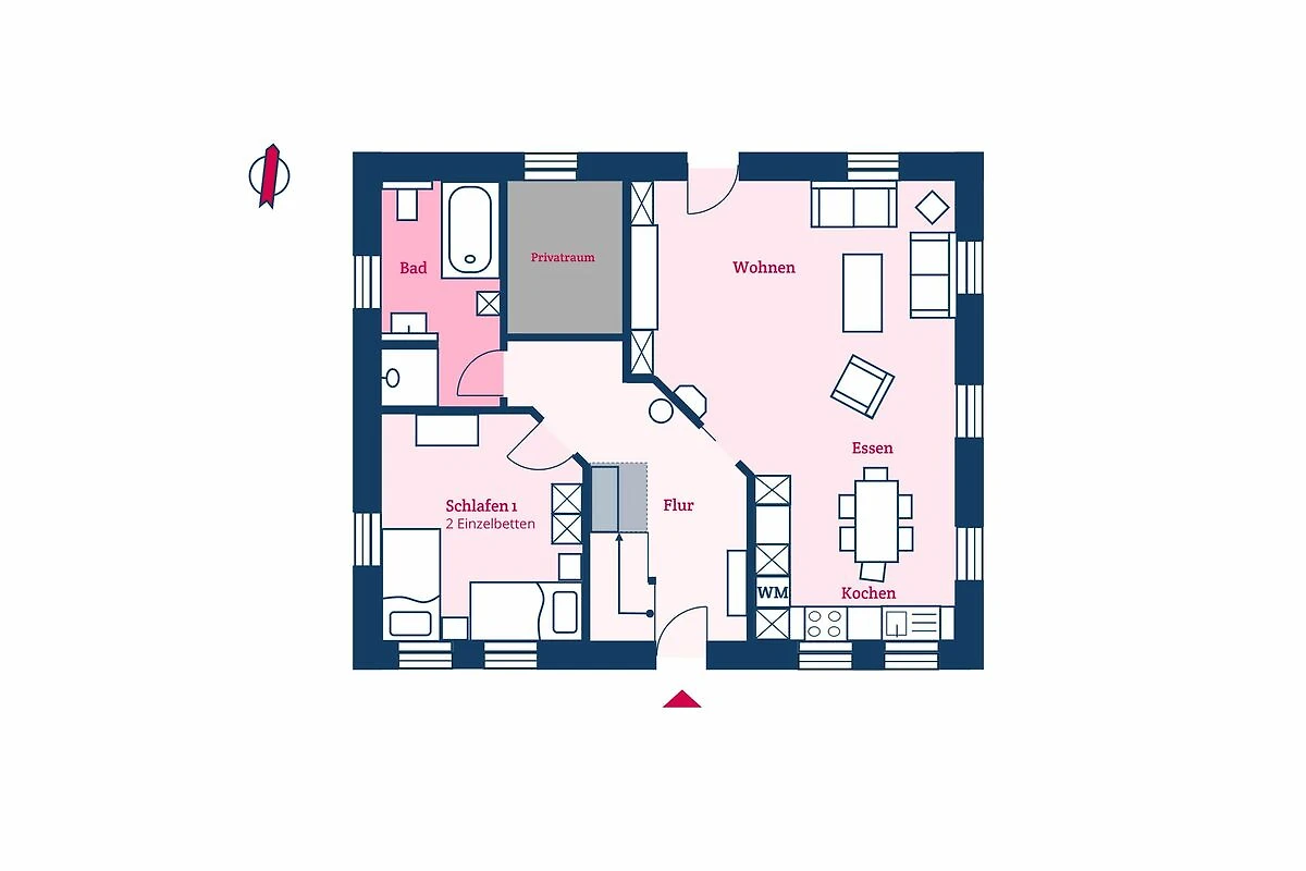 Im Erdgeschoss befinden sich ein Wohn- und Essbereich mit offener Küche, ein Schlafzimmer mit zwei Einzelbetten und ein Vollbad mit Badewanne und Raindance-Dusche, eine eingebaute Waschmaschine in der Küche. Über den Wohnbereich gelangen Sie auf die eigene Terrasse. Der Ethanol-Kamin sorgt auch an kühleren Tagen für eine angenehme Atmosphäre.