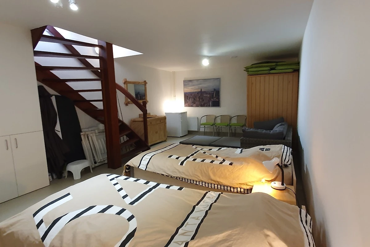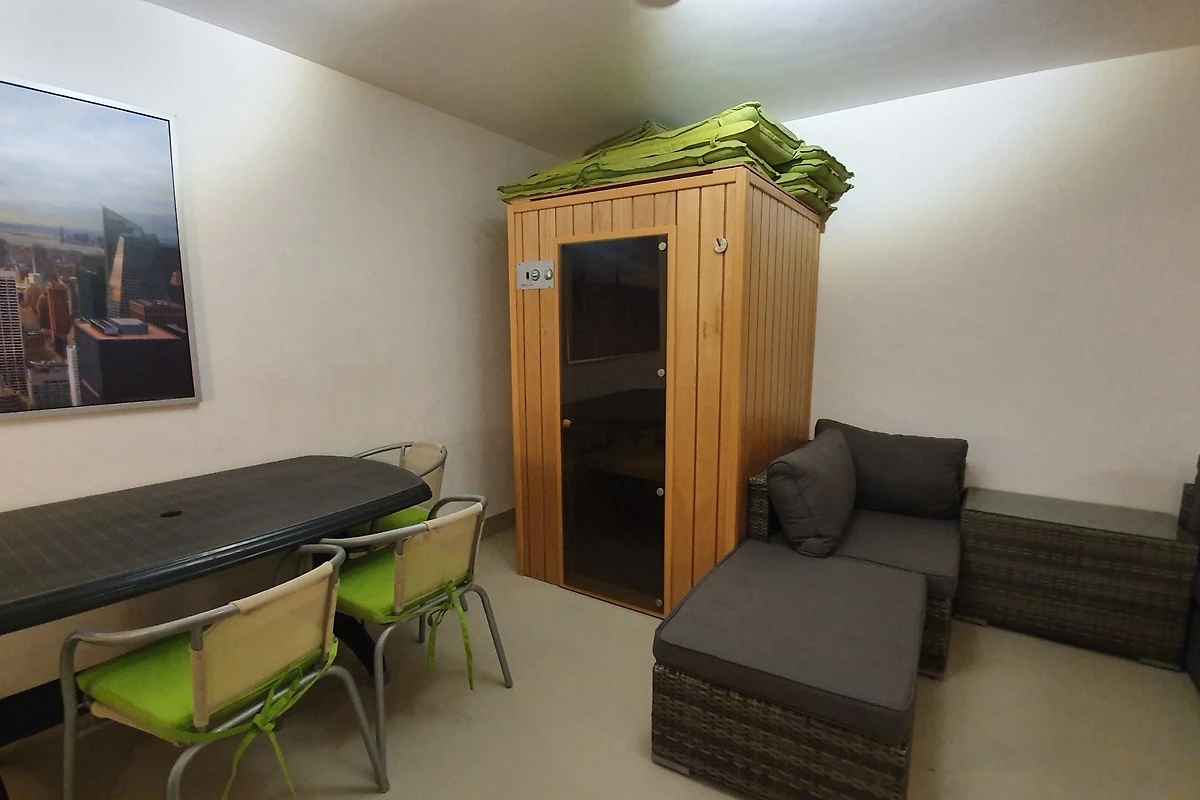 Im Keller befindet die 2 persoons Infrarotsauna und ein Gefrierschrank + 2 zusätzliche normale Betten + Waschbecken, Waschmaschine und Trockner.