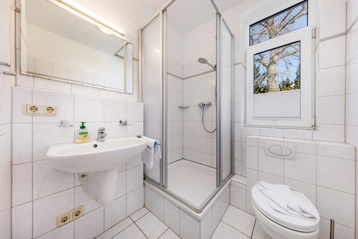 Das Badezimmer verfügt über Dusche, WC und einen Haartrockner.