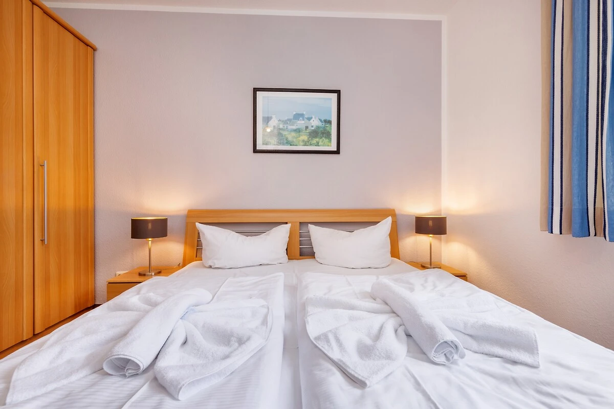 Das separate Schlafzimmer ist mit einem komfortablen Doppelbett (160 cm breit) und einem Kleiderschrank ausgestattet. Für Familien mit kleinen Kindern können Kinderreisebett und Hochstuhl auf Anfrage gegen Gebühr zur Verfügung gestellt werden.
