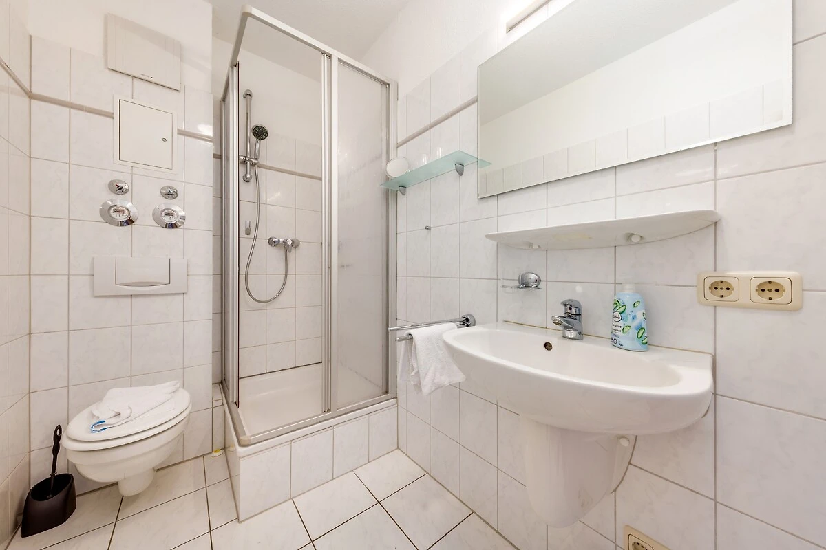 Das moderne Bad ist mit Dusche, WC und Haartrockner ausgestattet.