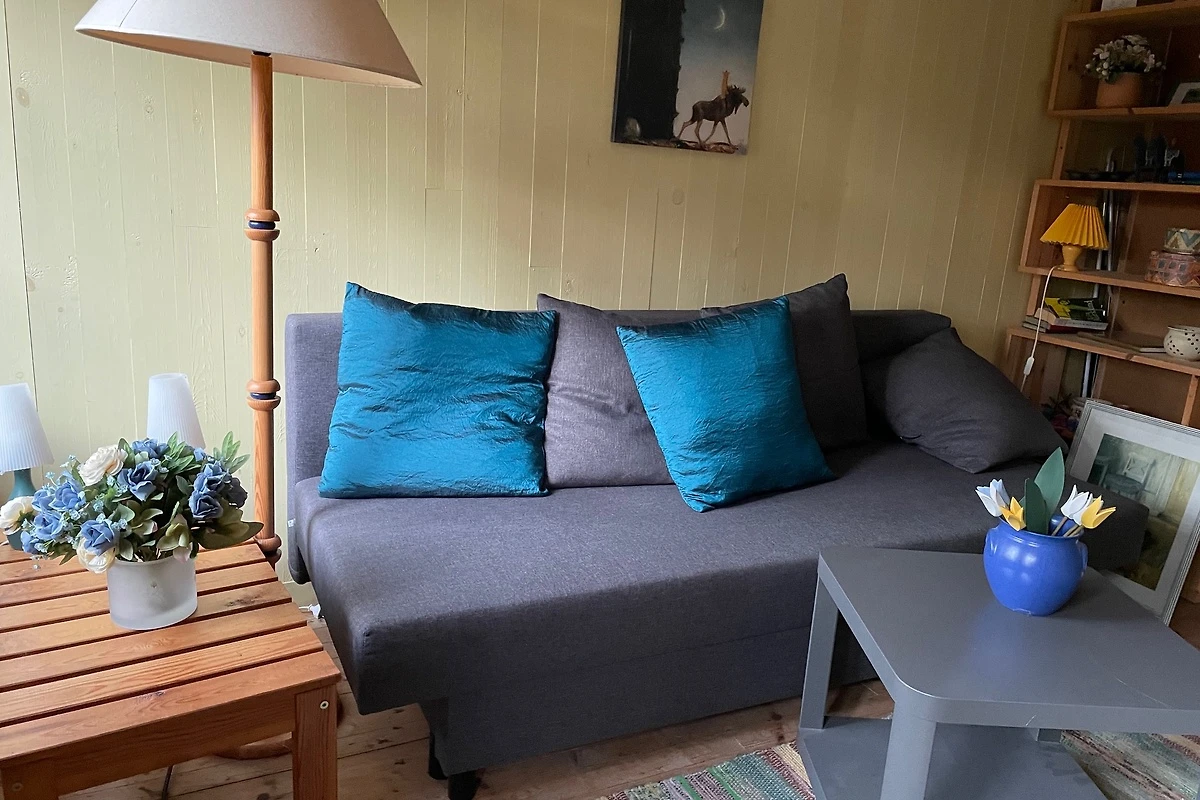 Im oberen Durchgangswohnzimmer bietet eine Ausziehcouch 1,40m x 1,80m, 2 weitere Schlafplätze oder die Möglichkeit sich zum Spielen oder Lesen zurückzuziehen.