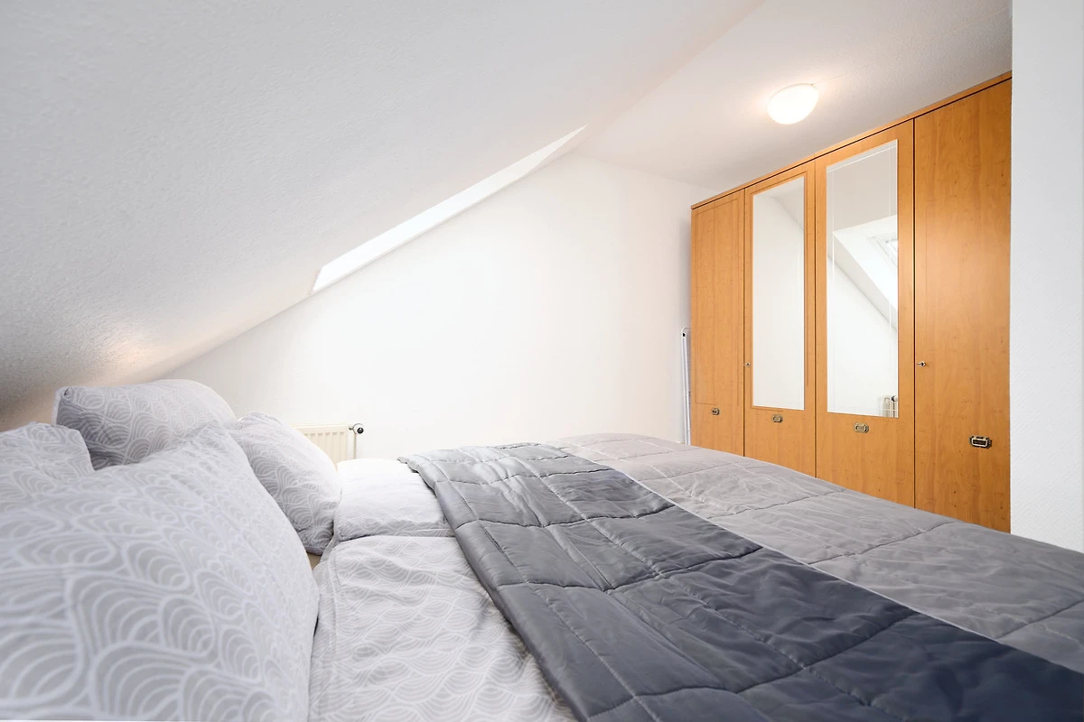 Schlafzimmer 1 (3. OG): 1 Doppelbett (2x 90x200 cm), Kleiderschrank, Verdunkelung: Veluxrollo und Hitzeschutzmarkise, kein Platz für ein Babybett vorhanden