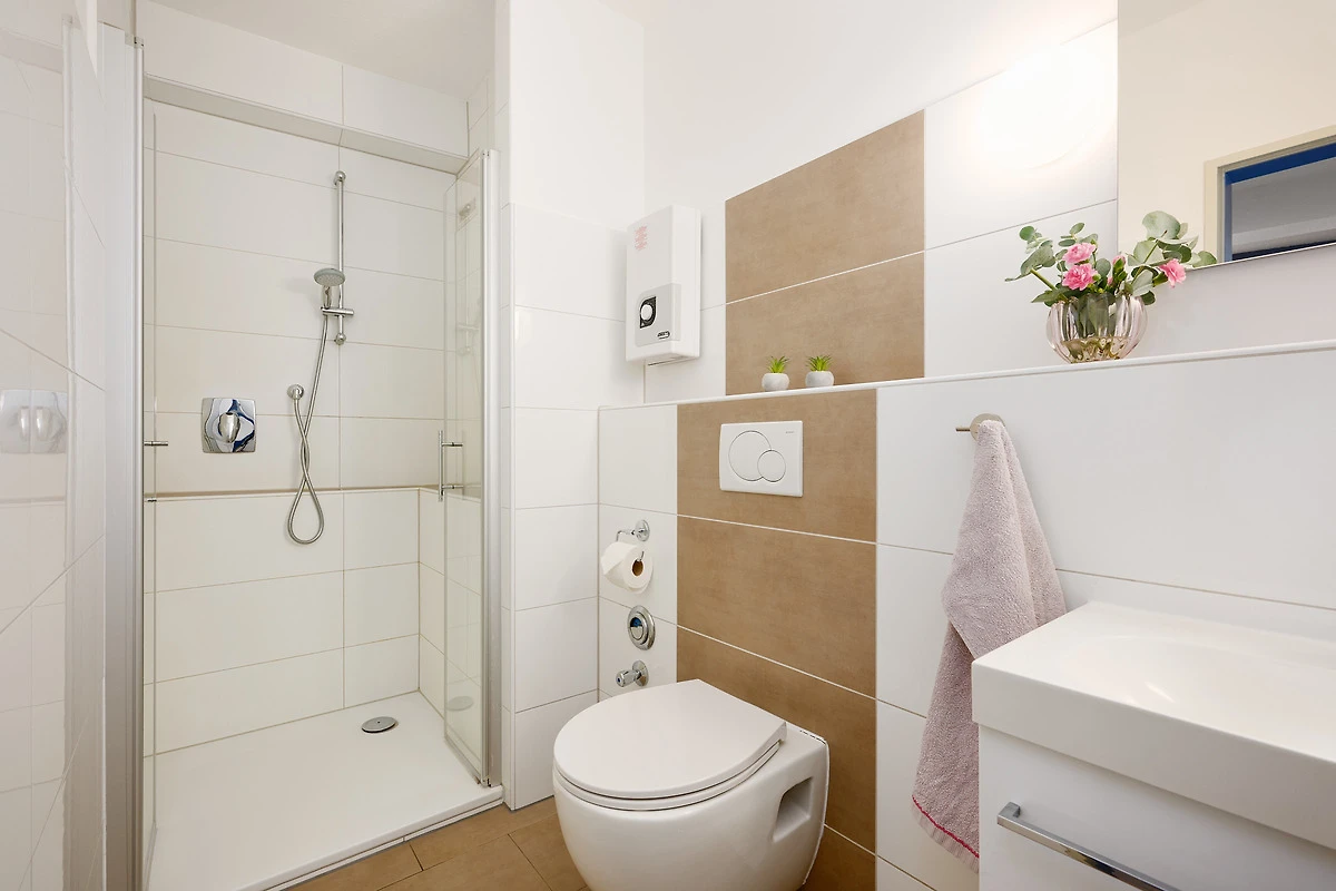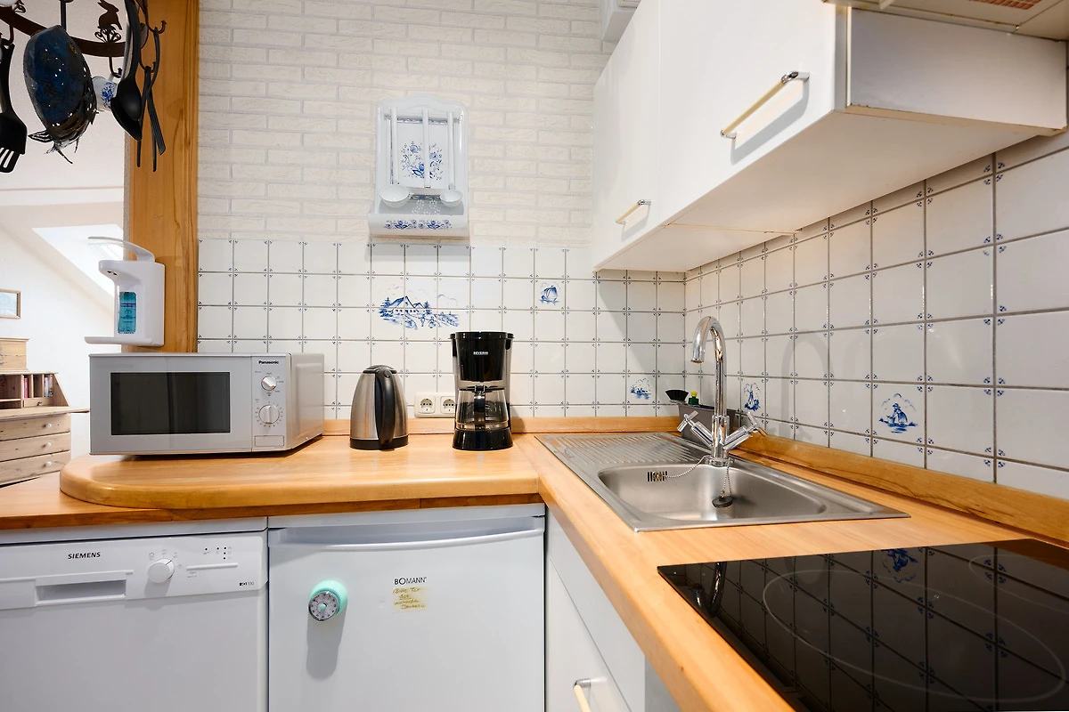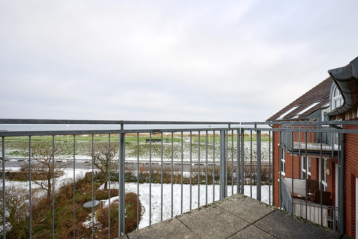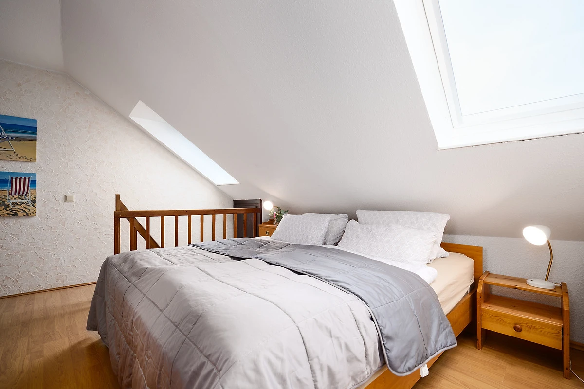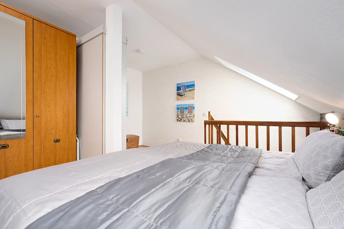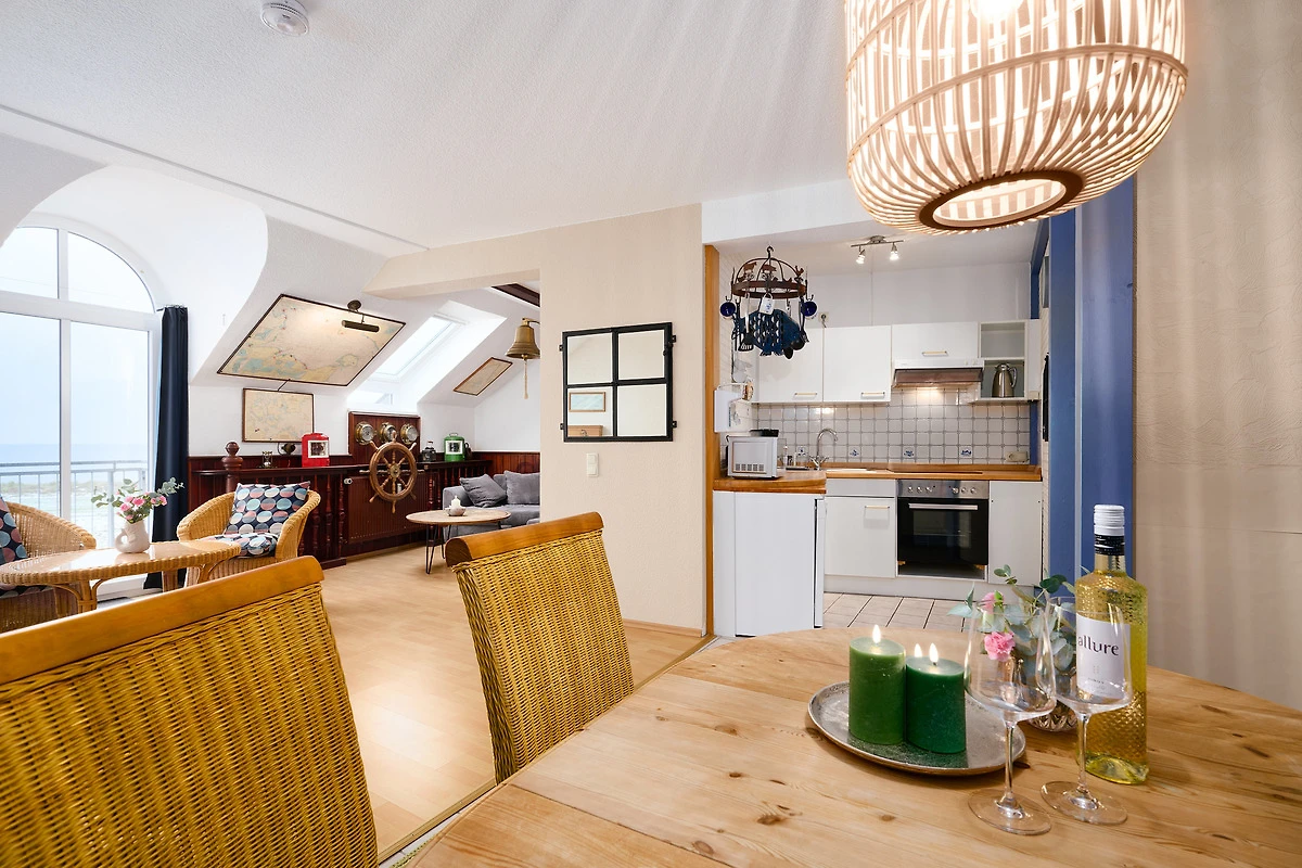 Der helle Wohnbereich lädt mit gemütlichem Sofa, Fernseher und Essbereich zum Entspannen ein. Vom angrenzenden Balkon mit Westausrichtung geniessen Sie sonnige Stunden und den Blick auf das Meer. Die moderne Küche ist bestens ausgestattet mit Backofen, Geschirrspülmaschine, Kühlschrank mit Gefrierfach, Kaffeemaschine, Wasserkocher, Toaster und Mikrowelle – ideal, um auch im Urlaub komfortabel zu kochen. Im Schlafzimmer im 3. Obergeschoss sorgt ein komfortables Doppelbett für erholsamen Schlaf, ein zusätzliches Schlafsofa im Wohnbereich bietet Platz für zwei weitere Gäste. Das Badezimmer verfügt über eine Dusche (Einstiegshöhe: 4 cm), WC, Föhn und praktische Ablagemöglichkeiten.