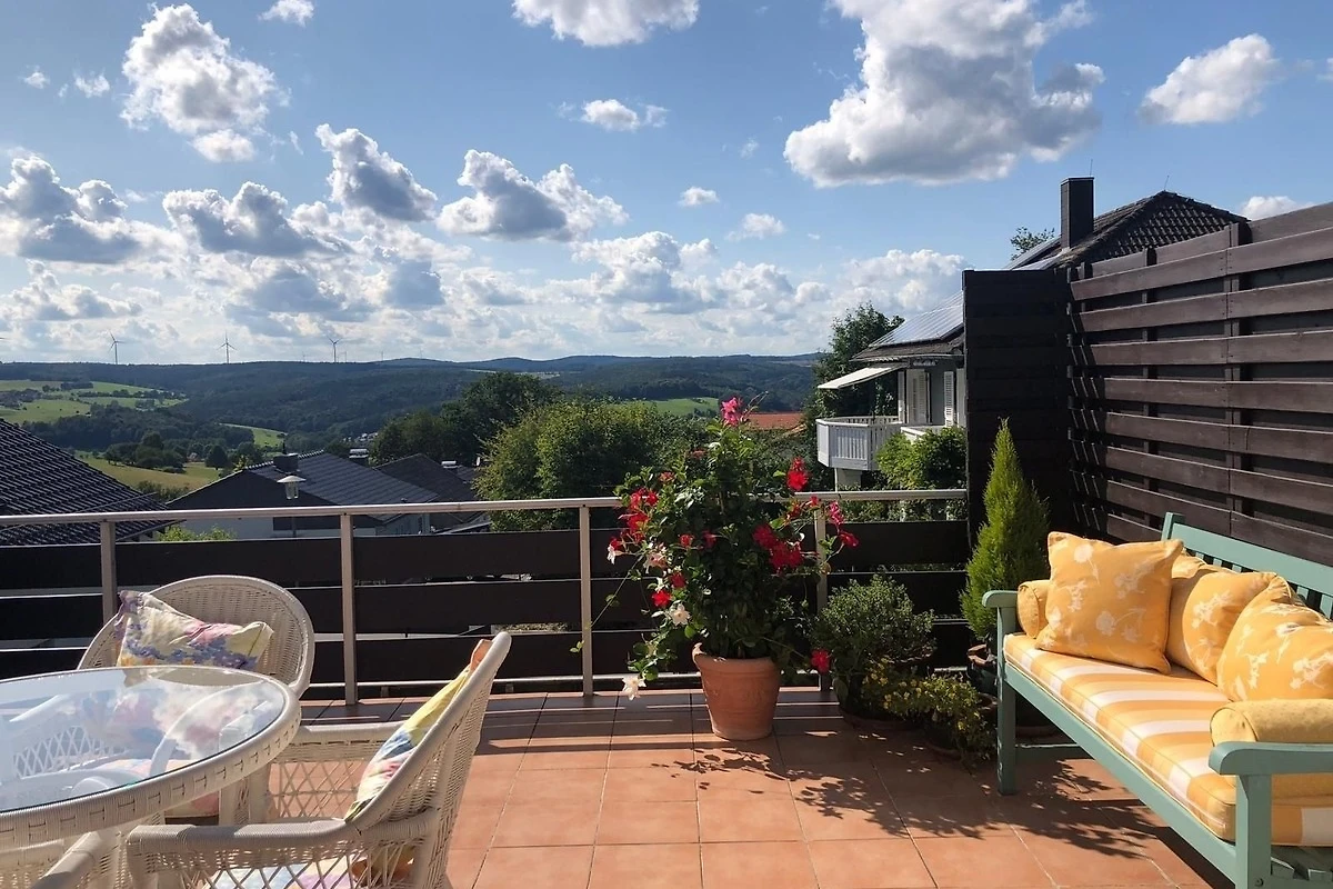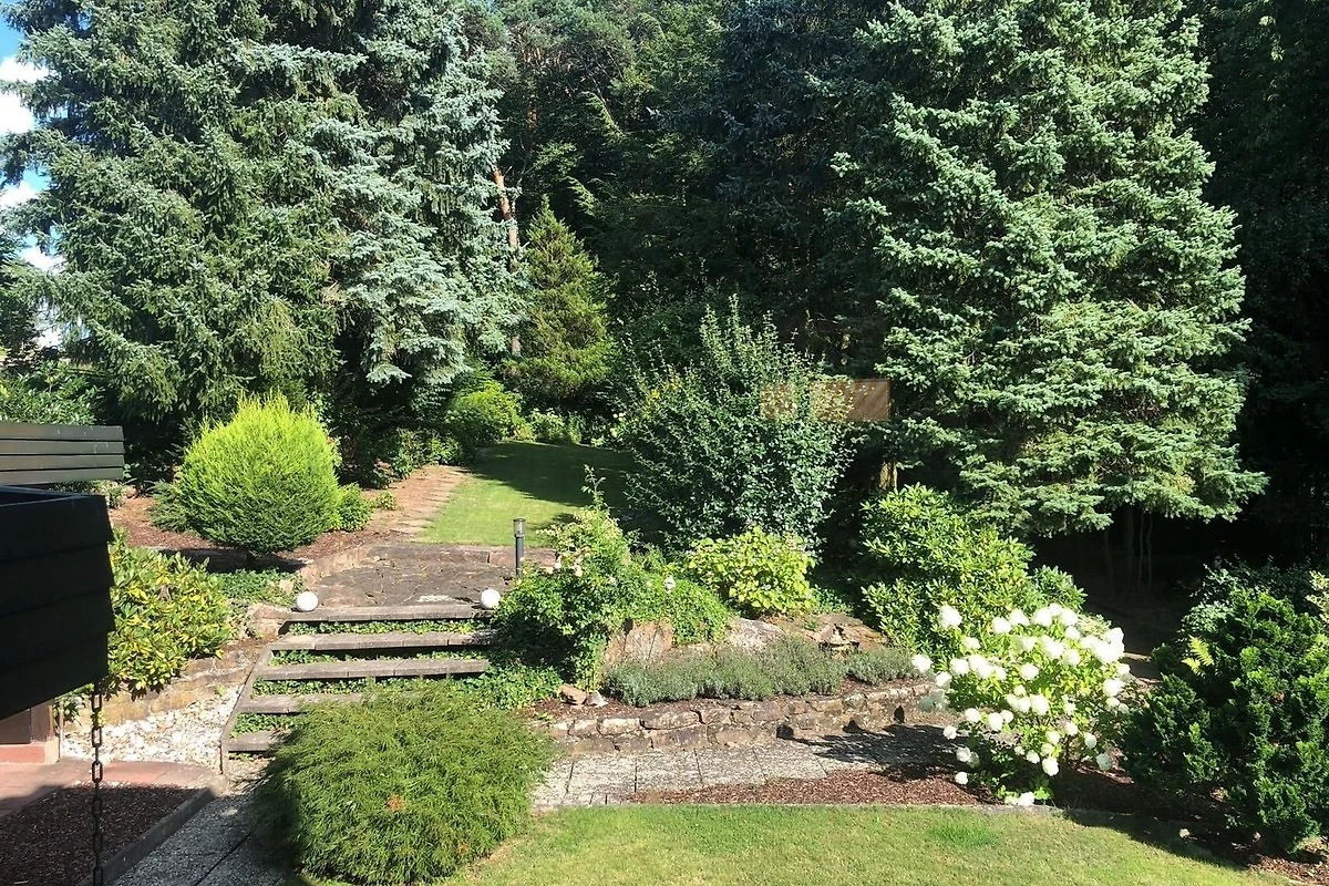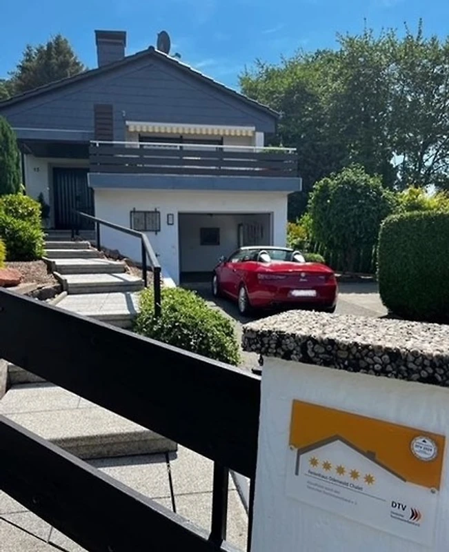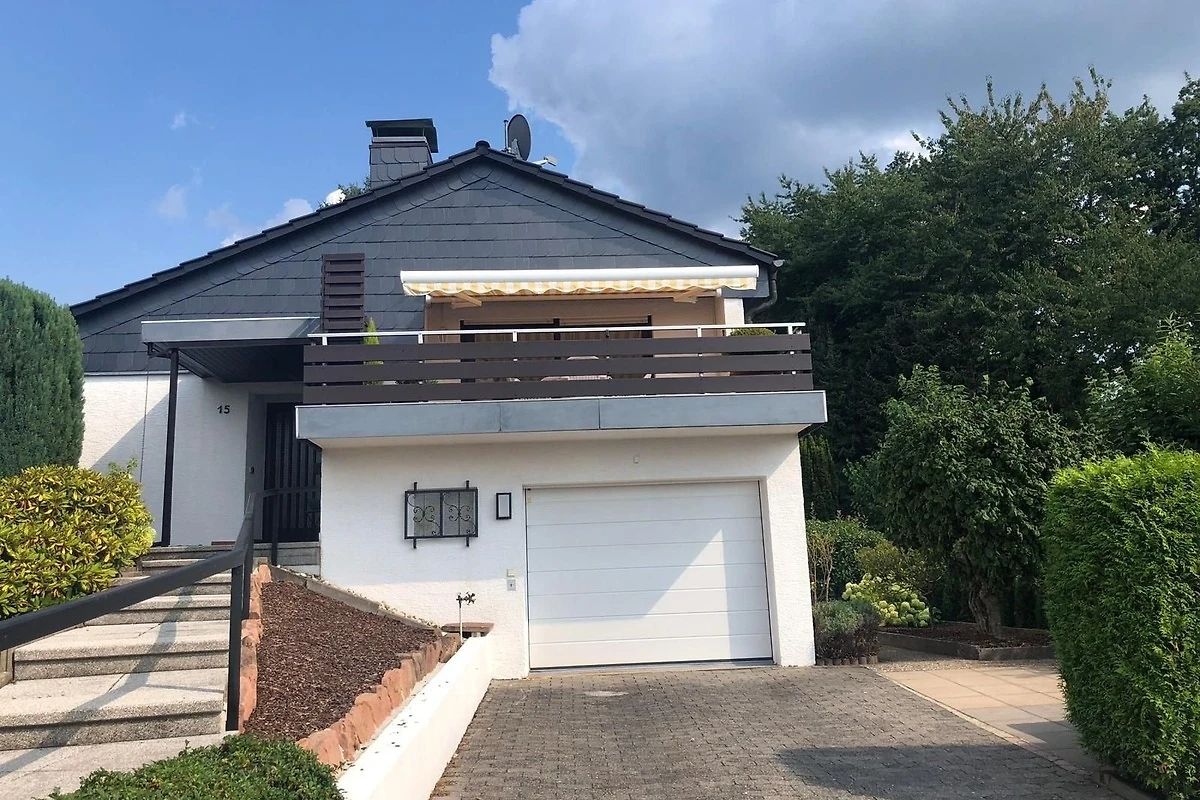 5 Sterne Ferienhaus mit 125 m² für bis zu 6 Personen. 3 Schlafzimmer, 2 grosse Badezimmer, grosszügige Terrasse mit Panorama-Fernblick, überdachter Freisitz mit Gasgrill. Garage und 3 PKW Stellplätze im Hof. Herrlich ruhig am Waldrand gelegen.