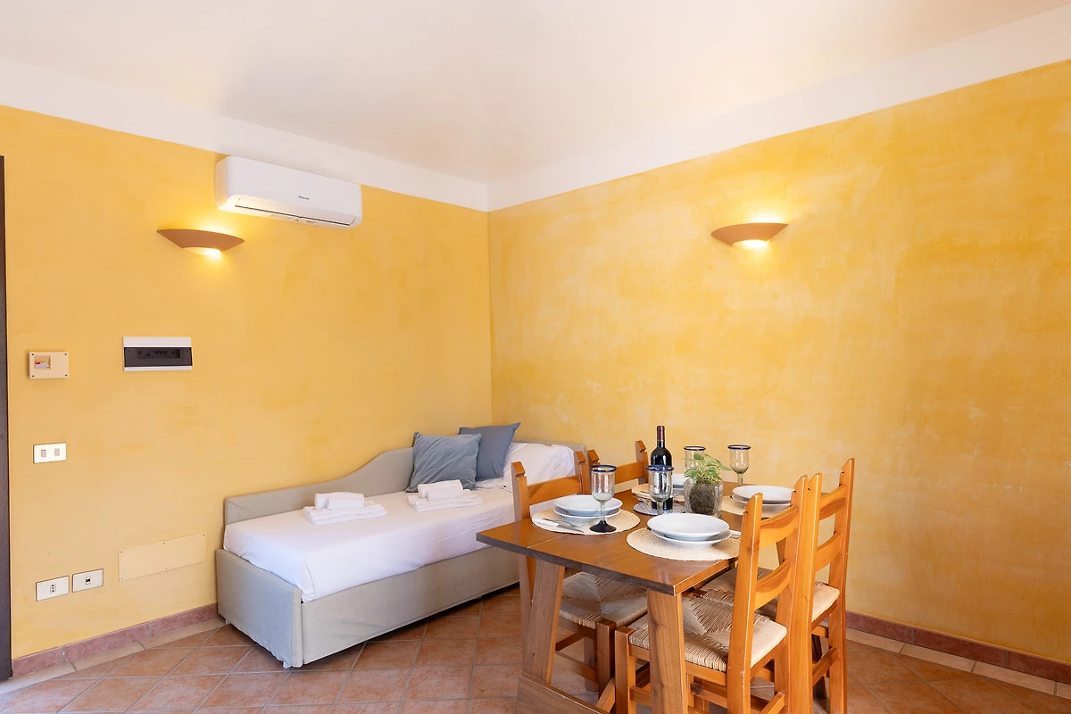 Die elegant eingerichteten Apartments sind halbkreisförmig um einen schönen Swimmingpool angeordnet und verfügen über eine ausgestattete Küchenzeile, Klimaanlage und ein eigenes Badezimmer mit Dusche. Jede Unterkunft verfügt über einen möblierten Balkon oder eine Terrasse mit Blick auf das üppige Grün des Pinienwaldes. Die Gäste können die gemeinsamen Einrichtungen nutzen: einen grossen Salzwasserpool mit grossem Solarium, den Grillplatz, ideal für gesellige Momente, eine Bar mit gemütlichem Entspannungsbereich und kostenlose Parkplätze für Gäste. Die Freundlichkeit und Hilfsbereitschaft unseres Empfangspersonals wird Ihren Urlaub krönen.