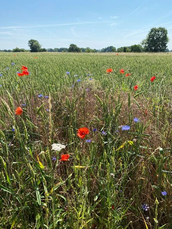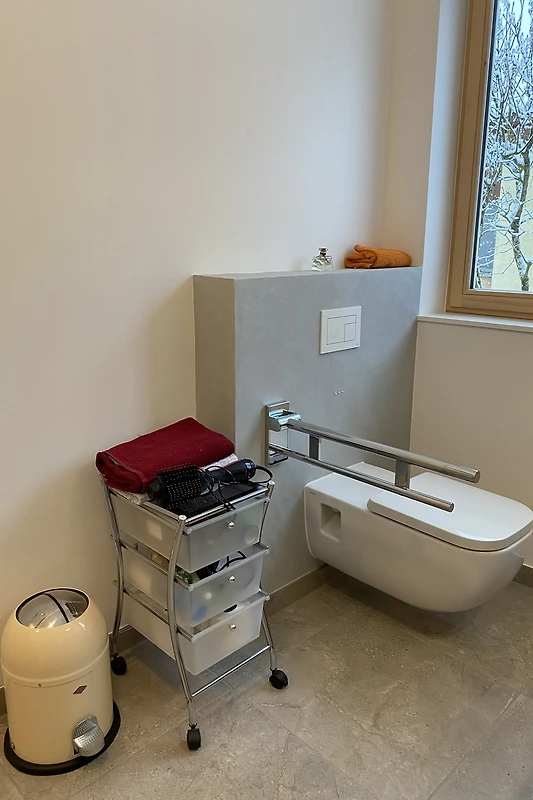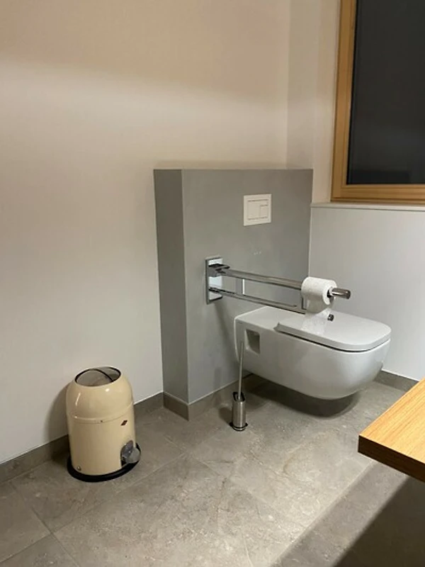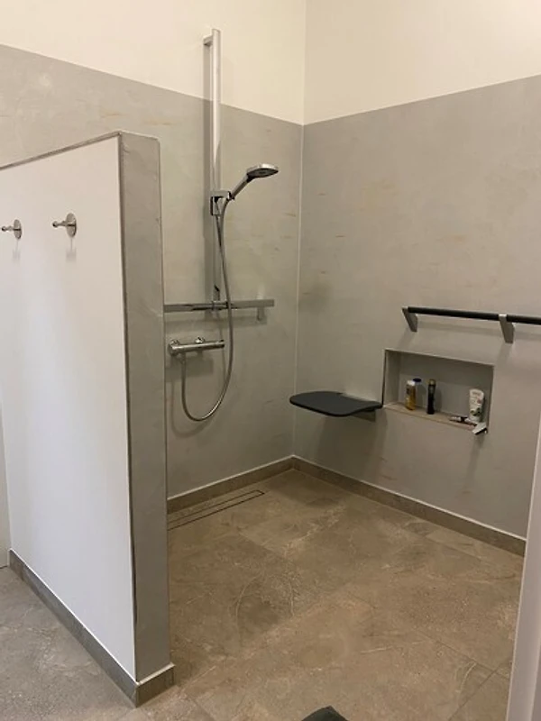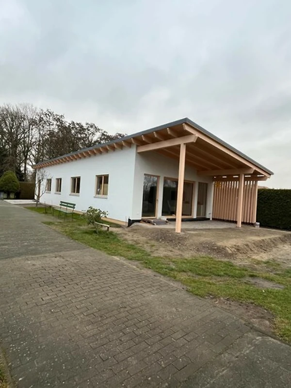 Erholen Sie sich in unserem Ferienhaus. Es steht in mitten eines Dorfes im Norden von Brandenburg. Felder, Wälder und Seen, so wie kleine Städte und gepfleget Dörfer prägen die Umgebung. Wir haben in vielen Details auf die Bedürfnisse von Rollstuhlfahrern geachtet. Vom großen Parkplatz vor dem Hauseingang gelangt man stufenlos ins Haus. Hier führt ein breiter als Galerie genutzter Flur zu den Zimmern und am Ende in die geräumige Wohnküche mit verglaster Front zur Terrasse. Das Masterbad ist mit einem unterfahrbarem Waschtisch, einem DIN WC mit klappbarem Haltergriff und einer befahrbaren Dusche mit Haltegriffen und Klappsitz ausgestattet. Die teilweise überdachte Terrasse mit 35 m² lädt zum gemütlichen Verweilen ein. Der kleine Garten davor bietet zu jeder Jahreszeit einen entspannenden Anblick.