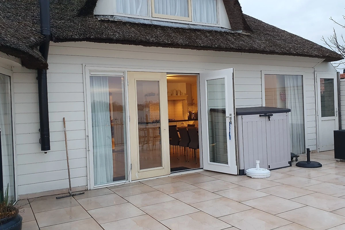 Das Familienferienhaus "Riet 159" liegt direkt am Wasser. Das Ferienhaus ist eine Wasservilla mit Innenhof