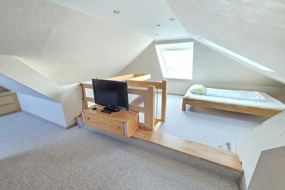 Die Wohnung empfängt Sie mit einer offenen und hellen Wohnatmosphäre. Der sonnige Balkon mit Süd-West-Ausrichtung lädt dazu ein, die Abendsonne in Ruhe zu geniessen. Im unteren Bereich befindet sich ein gemütliches Schlafzimmer mit Doppelbett, während das geräumige Schlafzimmer im Obergeschoss mit einem weiteren Doppelbett, einem 140 cm breiten Einzelbett sowie einem zusätzlichen TV ausgestattet ist – perfekt für Familien oder Gäste, die etwas mehr Platz wünschen. Das obere Schlafzimmer ist über eine Treppe im Wohnraum zu erreichen und ist offen gehalten