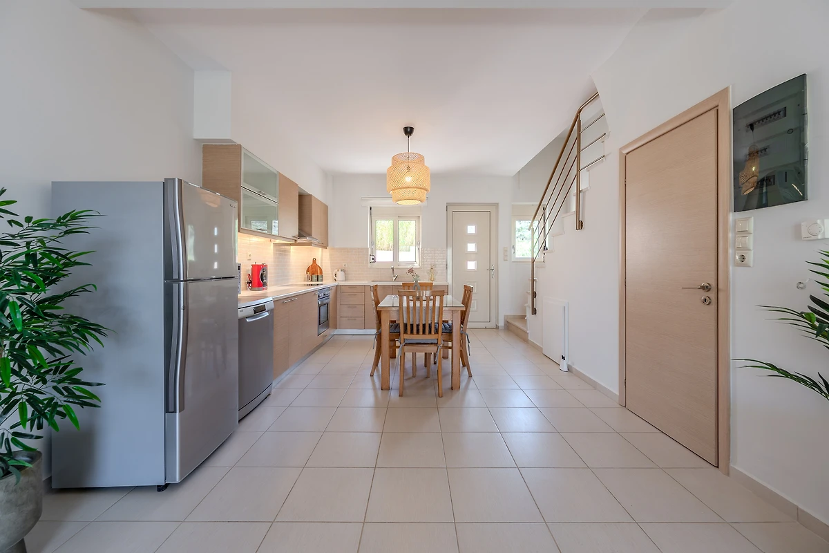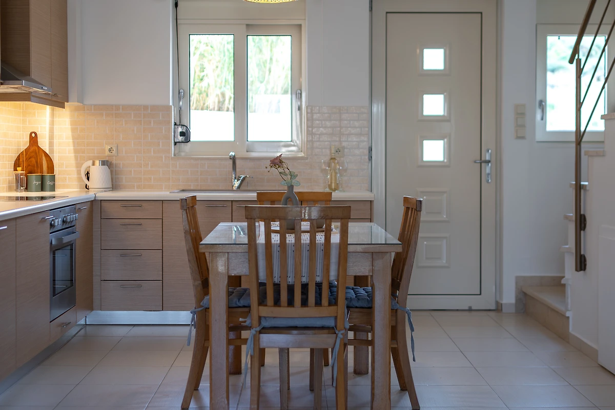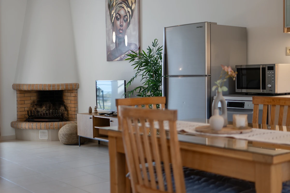 Im Inneren sorgt ein stilvoller Kamin an kühleren Abenden für behagliche Atmosphäre. Die voll ausgestattete Küche mit Küchenzeile, Geschirrspüler, Mikrowelle, Wasserkocher und Kaffeemaschine lädt zum gemeinsamen Kochen ein. Bettwäsche ist inklusive, eine Waschmaschine steht bereit, ebenso wie ein Haartrockner. Für Familien mit Kleinkindern gibt es ein Babybett.