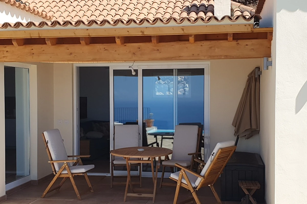 Direkt vom Wohnzimmer aus gehen Sie durch die Schiebetüren auf die überdachte Terrasse (3 x 4 m), die Ihnen nicht nur von beiden Seiten Schutz vor Wind und Regen bietet, sondern auch an sehr sonnigen Tagen Schatten spendet. Von dort aus schauen Sie auf den Infinity Pool und das Meer. Hier können Sie abends bei einem Glas Wein den Sonnenuntergang im Meer genießen.