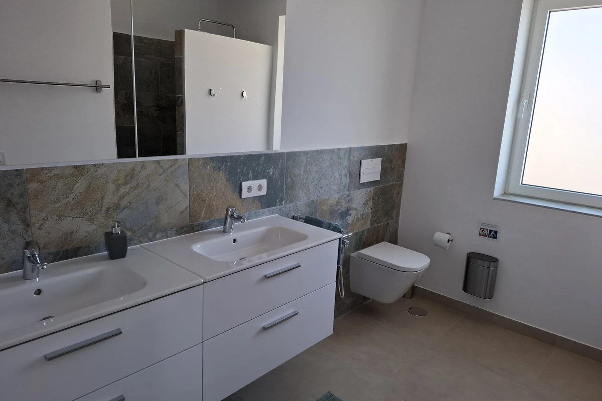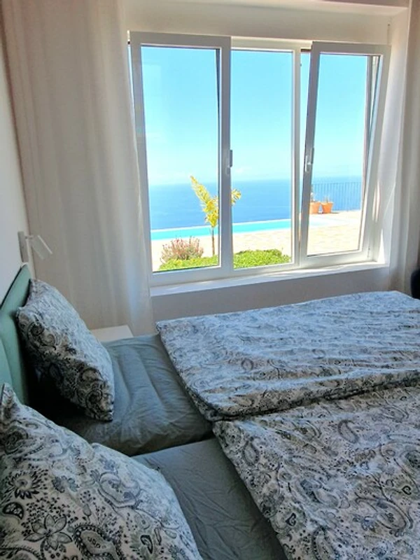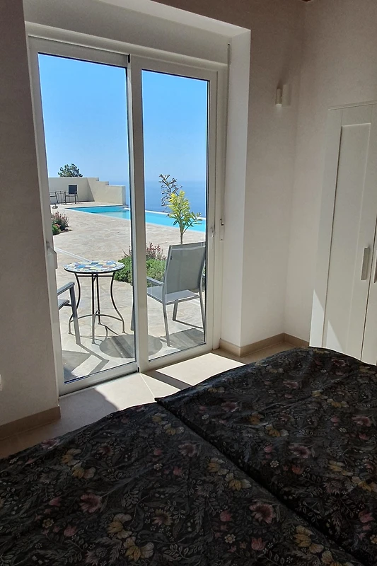 Es verfügt über zwei große Schlafzimmer mit jeweils zwei großen Doppelbetten (1,80 X 2,00 m) sowie den dazu gehörigen Bädern mit Regendusche. Von einem Schlafzimmer blickt man direkt durch ein großes Fenster auf den Pool und das Meer. Vom anderen Schlafzimmer schauen Sie ebenfalls auf Pool und Meer sowie den blühenden Garten und haben durch die große Schiebetür direkten Zugang auf die Terrasse. Beide Schlafzimmer verfügen über eine Klimaanlage.