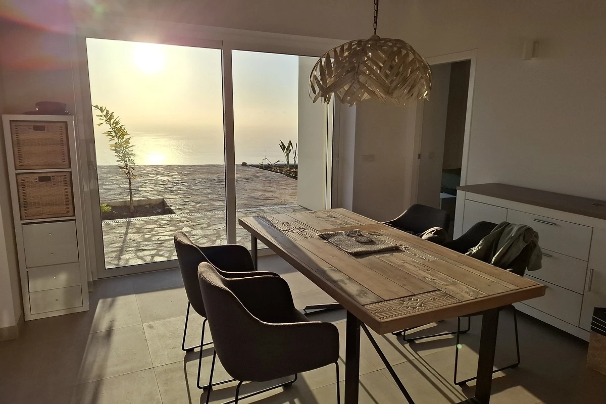 Der separate Essbereich mit Vintage Tisch und Lampe liegt direkt vor der sonnendurchfluteten Schiebetür und bietet einen wunderbaren Blick auf den Ozean.
