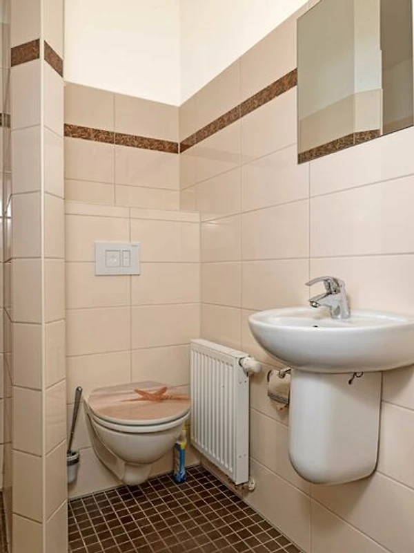 Das Haus verfügt über ein großzügiges Badezimmer mit Dusche im Obergeschoss, sowie über ein zusätzliches Gäste-WC mit Dusche im Erdgschoss.