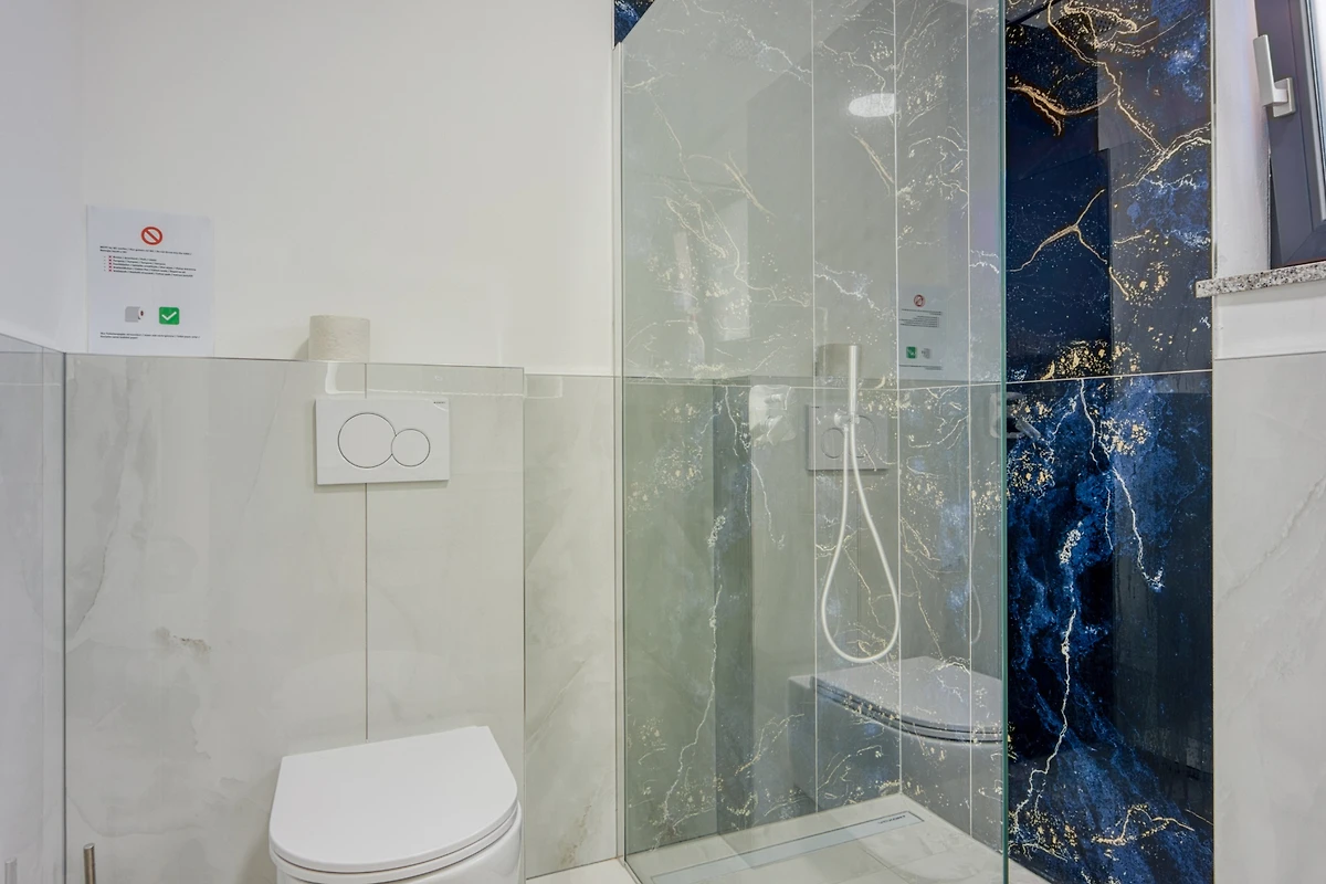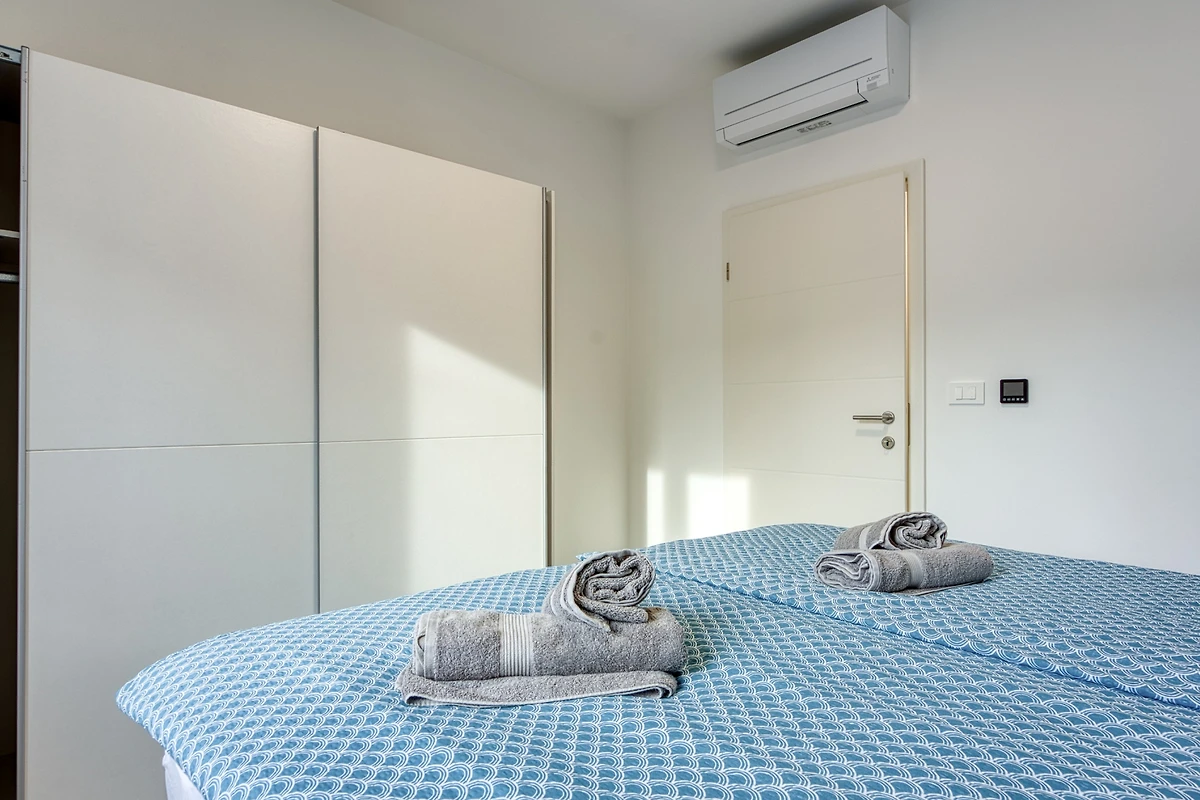 Die Wohnung verfügt über zwei gut ausgestattete Schlafzimmer, darunter ein Kingsize-Bett und zwei Einzelbetten, die bequem bis zu 4 Gäste unterbringen können. Die Schlafbereiche werden durch zwei Badezimmer ergänzt - eines mit Dusche und ein anderes mit Toilette - und gewährleisten Privatsphäre und Komfort für alle Bewohner.