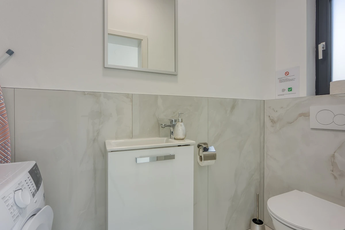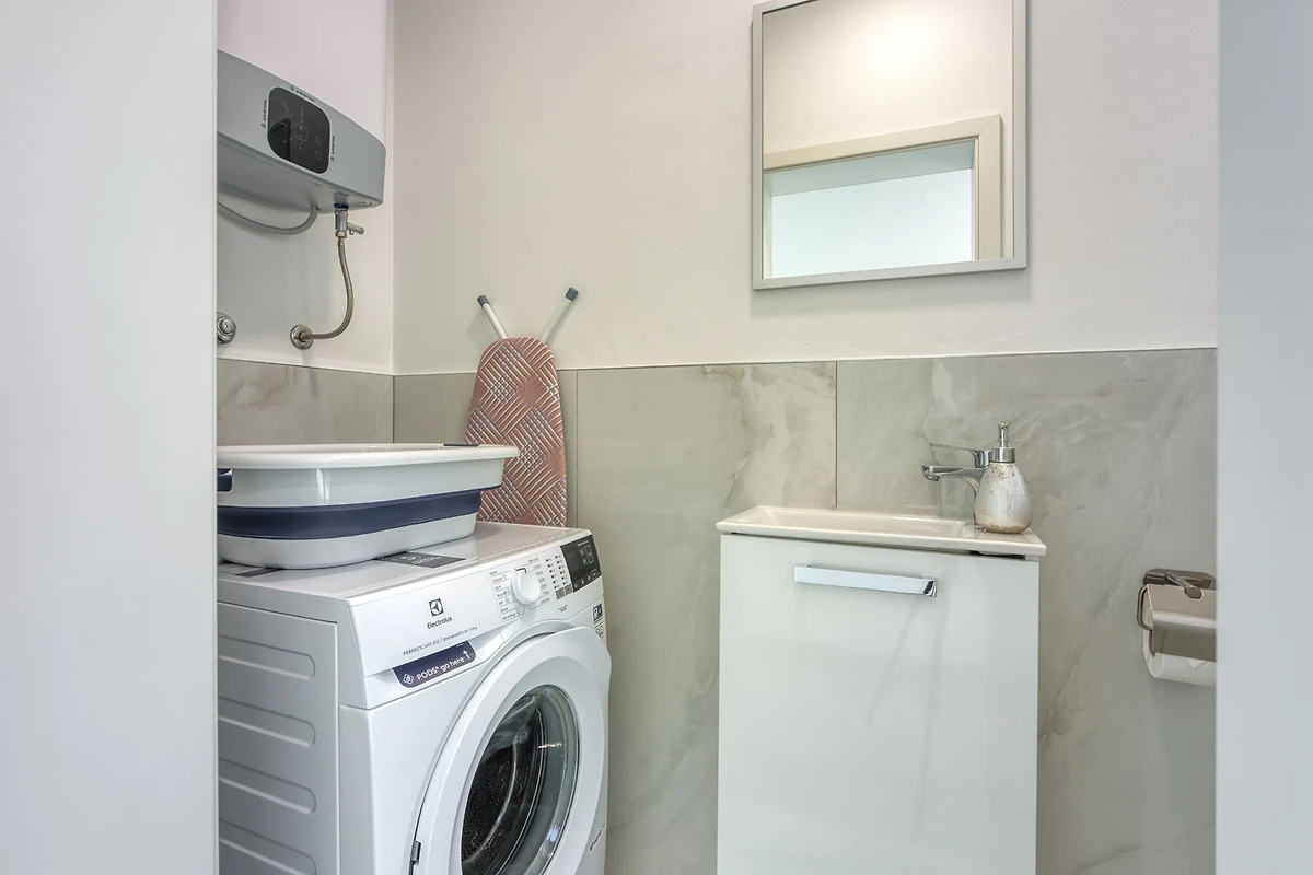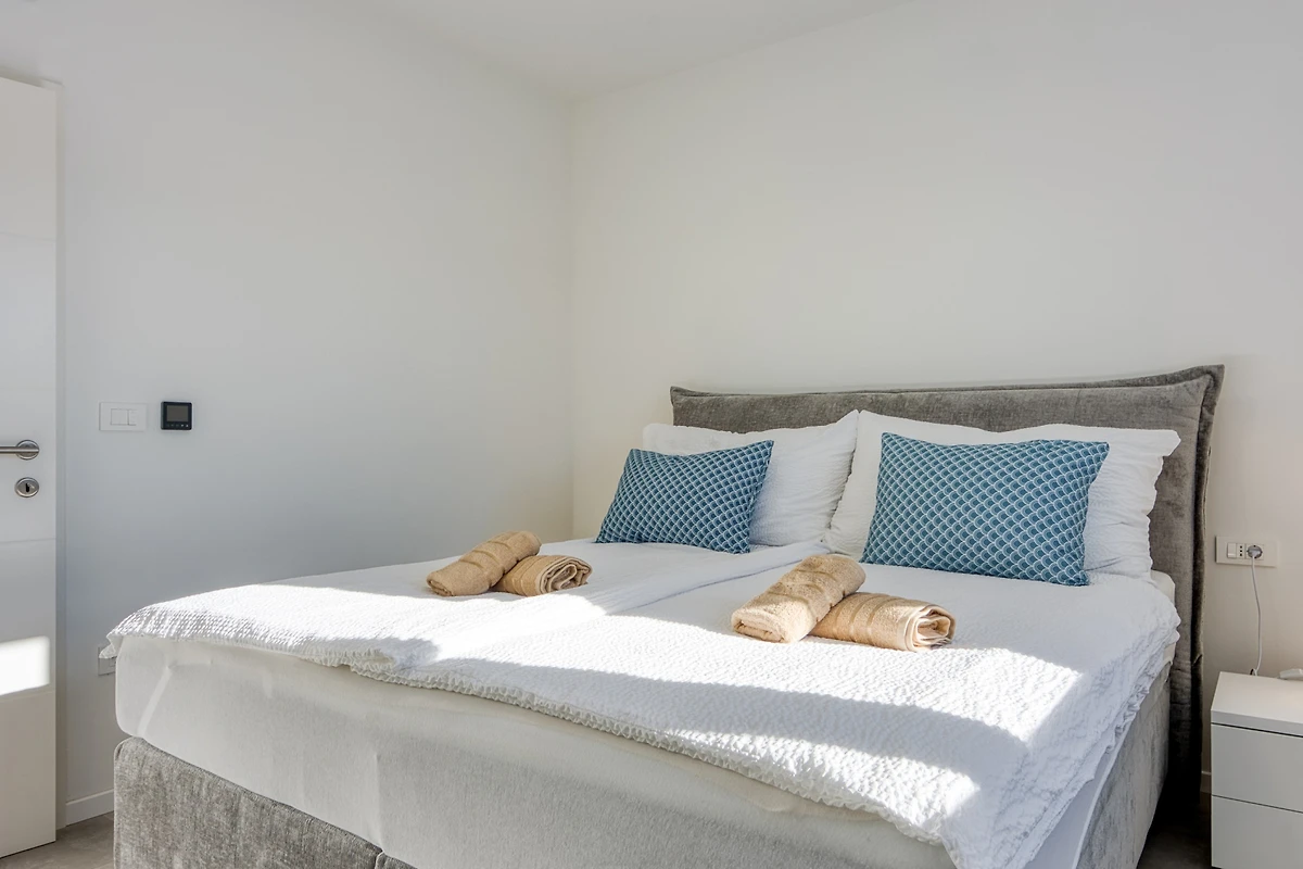 Die Wohnung verfügt über zwei gut ausgestattete Schlafzimmer mit verschiedenen Schlafmöglichkeiten: ein Kingsize-Bett und zwei Einzelbetten, die flexible und komfortable Schlafoptionen für bis zu 4 Gäste sicherstellen. Der Wohnbereich wird durch zwei Badezimmer ergänzt - eines mit Dusche und ein anderes mit Toilette - und bietet ausreichend Komfort für alle Bewohner.