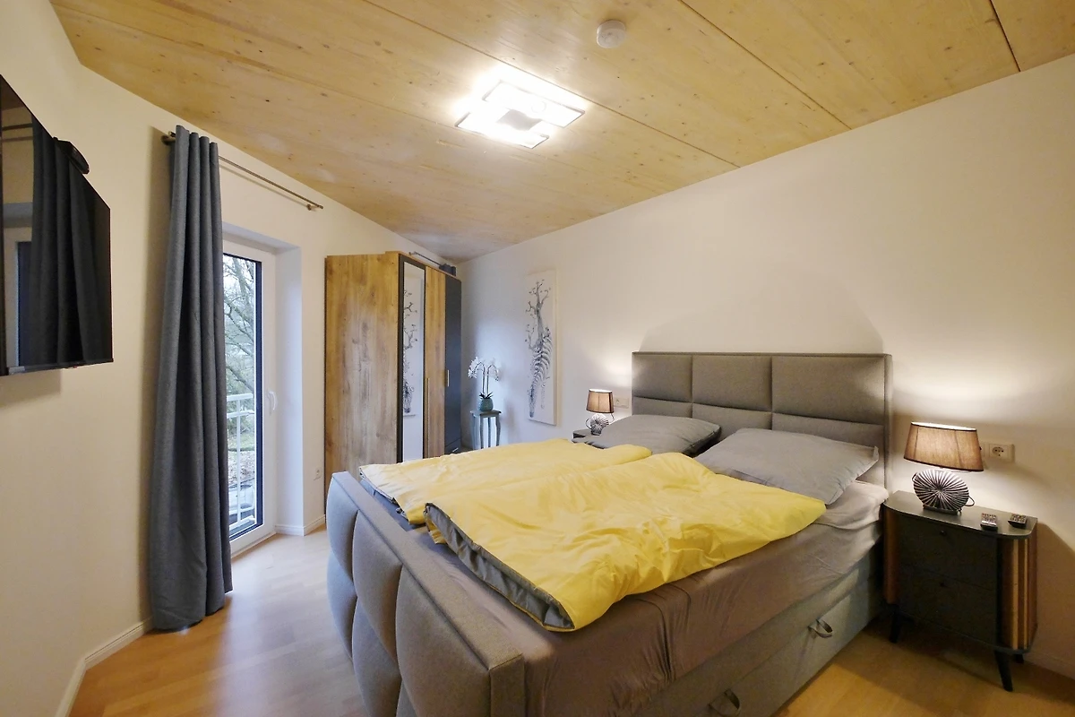 - ein Schlafzimmer mit Doppelbett, TV und Kleiderschrank (Babybett(Hochstuhl auf Anfrage).