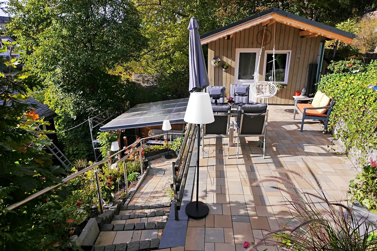 Einzigartig und wunderschön ist der terrassenförmige Berggarten hinter dem Haus mit mehreren Sitzguppen, Gartenhütte und Grillmöglichkeit.
