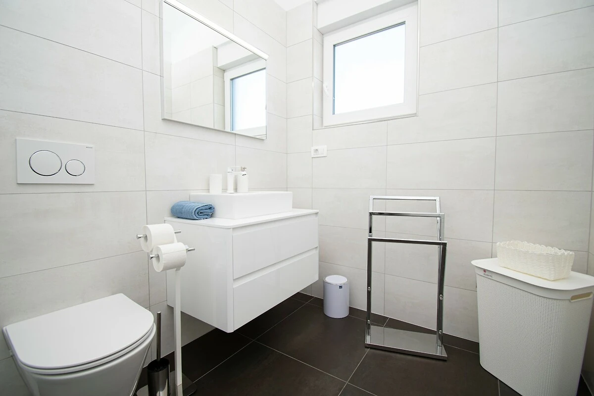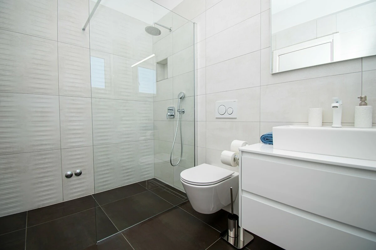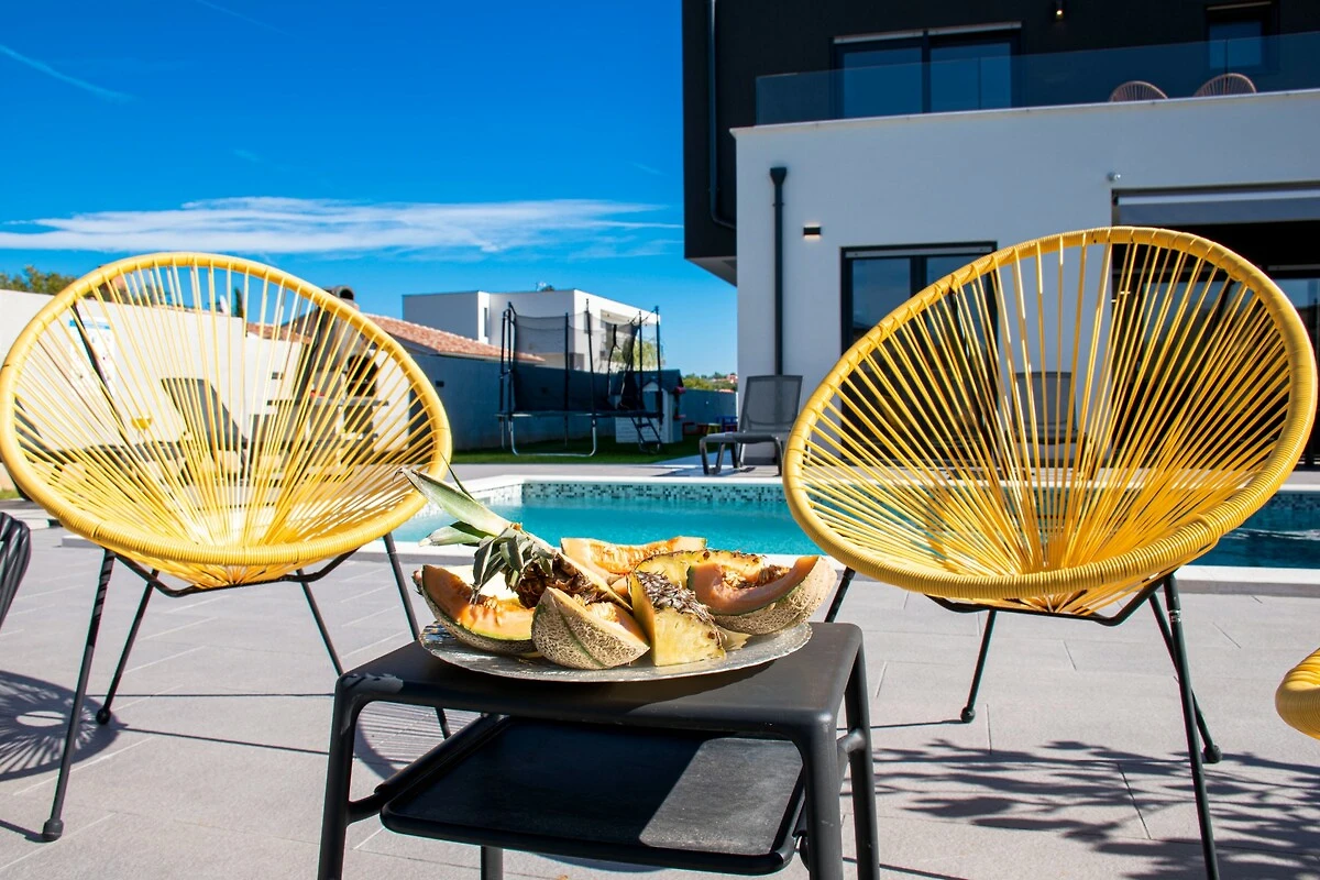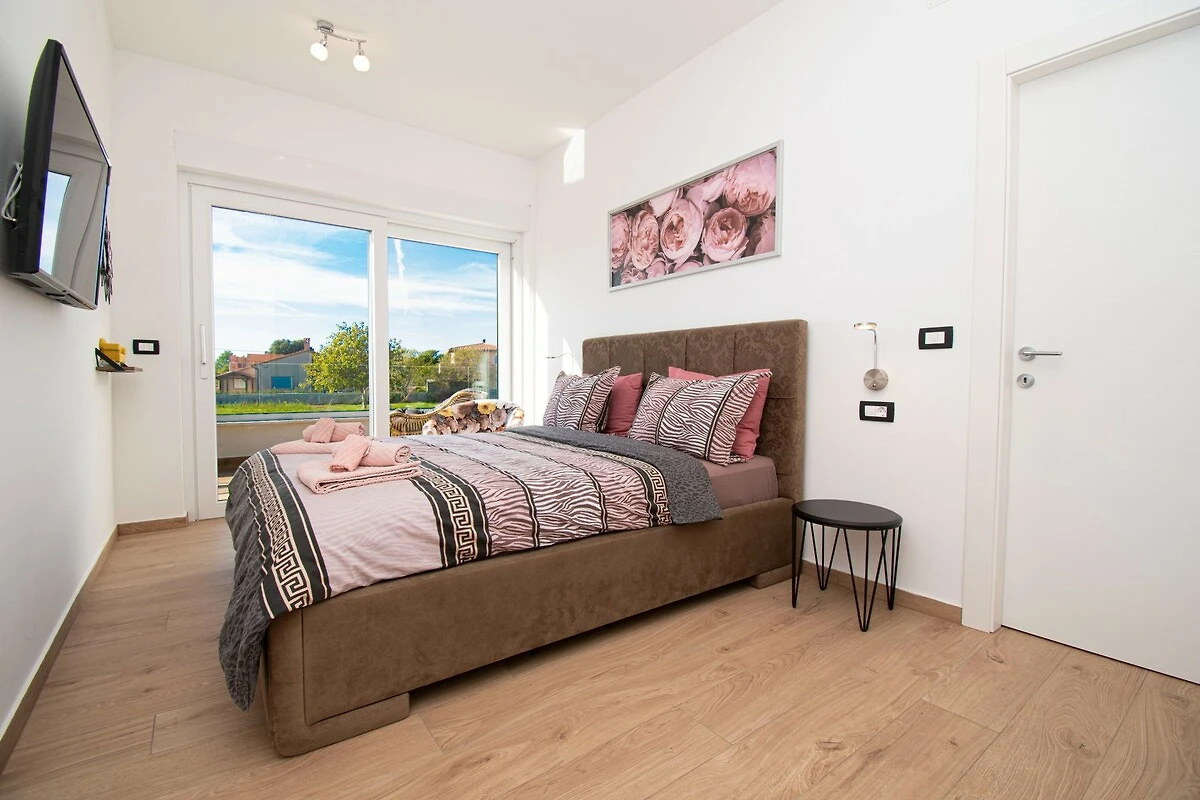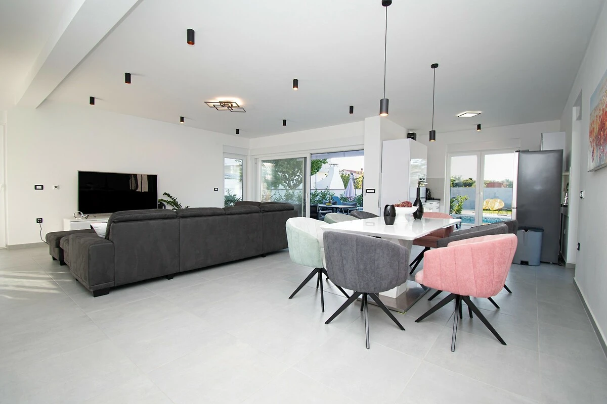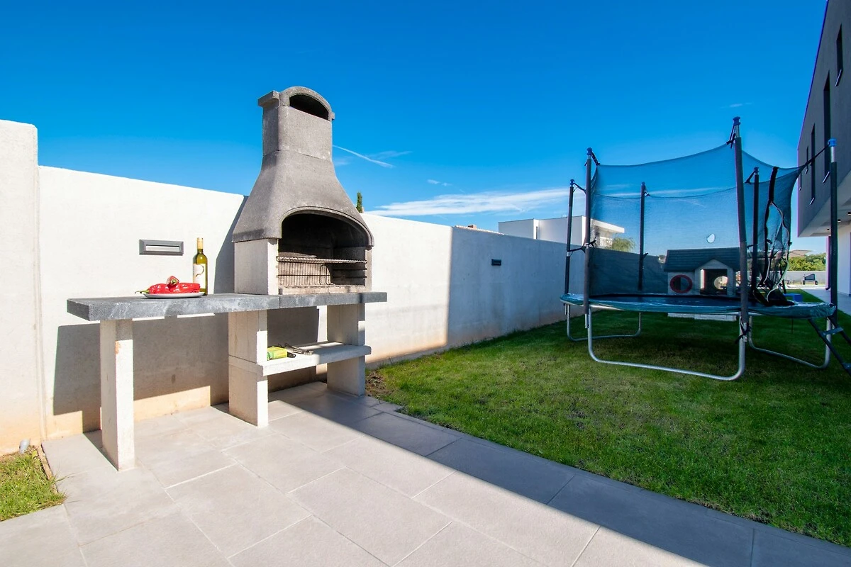 Die Villa Elite 1 ist eine moderne Villa in Pula in der Nähe des Meeres mit eigenem Pool. Die Villa bietet Platz für bis zu acht Personen in vier Schlafzimmern. Es ist eine Doppelhaushälfte und teilt sich eine Wand mit seiner Schwestervilla Elite 2. Beide Villen Elite 1 und Elite 2 teilen sich den vollständig umzäunten Garten, aber jede Villa ist ein autarkes Ferienhaus und verfügt über einen eigenen Swimmingpool, eine Terrasse und zwei Parkplätze. Elite 1 befindet sich im Vorgartenbereich. Im Garten gibt es einen eigenen Pool und Liegestühle. Nutzen Sie diesen also und schwimmen Sie, um sich tagsüber zu erfrischen, und entspannen Sie anschließend auf den Liegestühlen. Genießen Sie die Sonne für die perfekte Bräune mit einem kalten Getränk in der Hand. Nutzen Sie den Grill im Garten, um fantastische Mahlzeiten zuzubereiten, die Sie dann mit Ihrer Familie und Freunden im überdachten Essbereich im Freien genießen können. Hinter dem Haus befindet sich ein Kinderspielplatz, der tagsüber im Schatten liegt und auf dem Ihre Kinder sorglos spielen können. Die Villa verfügt über ein weitläufiges, helles und luftiges Erdgeschoss mit Wohnzimmer, Essbereich und Küche. Ein zusätzliches Badezimmer steht Ihnen hier zur Verfügung. Der Wohnbereich bietet allen Gästen ausreichend Platz, um ihre gemeinsame Zeit zu genießen, indem Sie beispielsweise über TV Ihrem Lieblingssportteam bei einem wichtigen Spiel zuschauen oder Ihre Lieblingshits auf der Karaoke-Maschine als unterhaltsame Aktivität mitsingen. Auf der ersten Etage der Villa befinden sich vier Schlafzimmer, alle mit eigenem Bad, sowie eine große Terrasse - der perfekte Ort für die erste Tasse Kaffee oder Tee am Morgen, während die Sonne über der Region aufgeht. Die Villa Elite 1 befindet sich am Stadtrand von Pula, sodass Sie bequem zum nahe gelegenen Strand gehen oder viele alte Sehenswürdigkeiten der Stadt erkunden können. Pula bietet eine reichhaltige Gastro-Szene. Wenn Sie ein Feinschmecker sind, haben Sie viele Restaurants zur Auswahl.