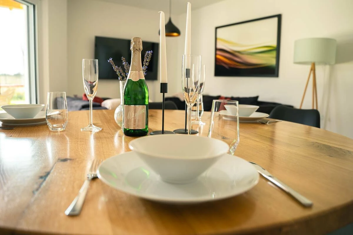 Die Bungalows werden mit einer hochwertigen, voll ausgestatteten Küche (u. a. Induktion) eingerichtet. Ein gemütlicher Essbereich mit luxuriösem Eichentisch lädt zum gemeinsamen Verweilen ein. Auf Wunsch stellen wir Ihnen gerne einen Kinderhochstuhl bereit.