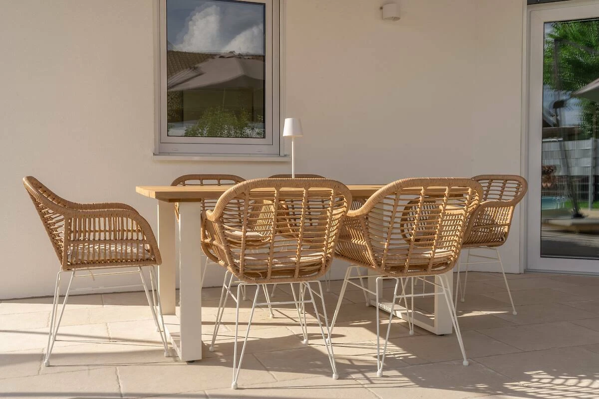 Die nach Süden ausgerichtete Terrasse bietet einen traumhaften Ausblick und direkten Zugang zum Pool – perfekt für entspannte Stunden im Freien.