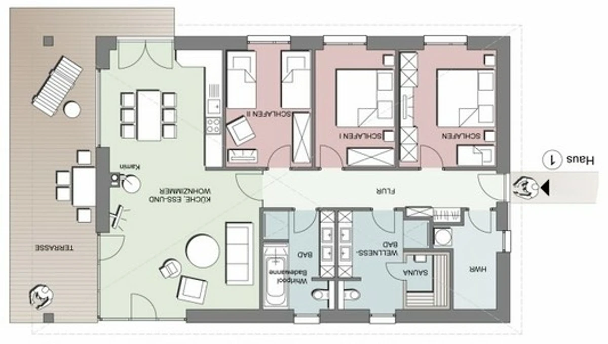 • Zwei Schlafzimmer mit jeweils einem 180×200 cm großen Doppelbett,