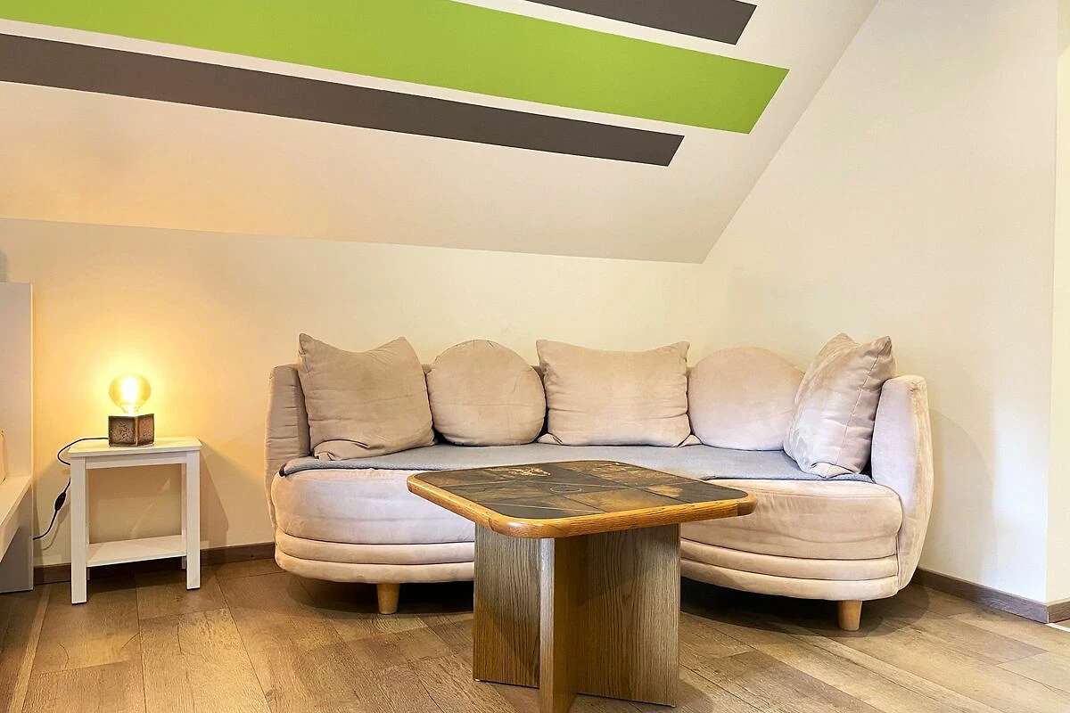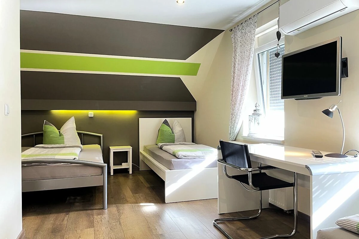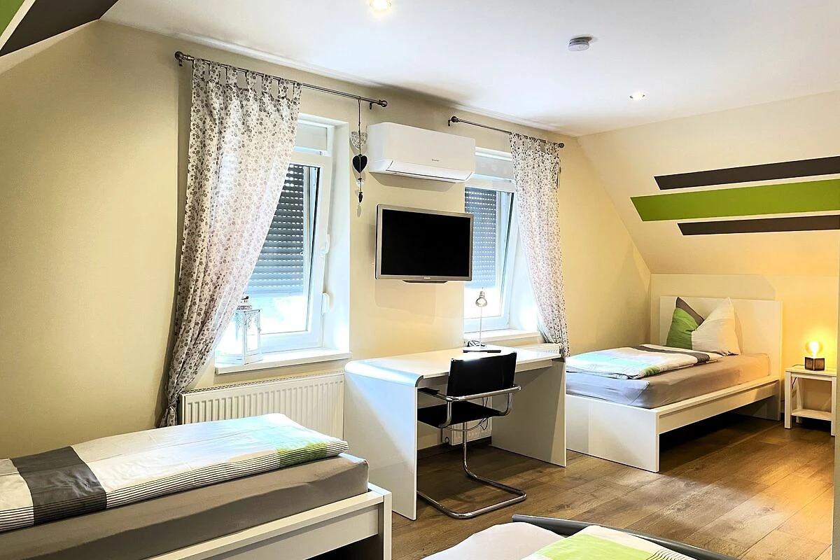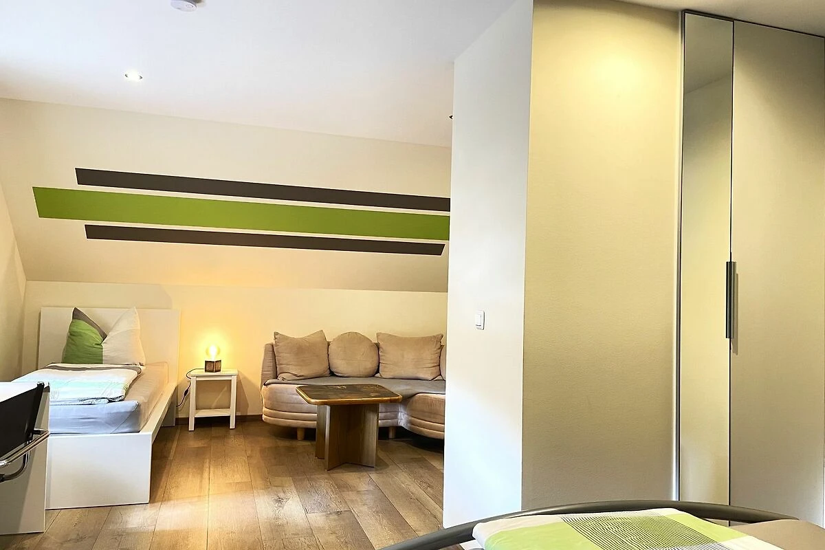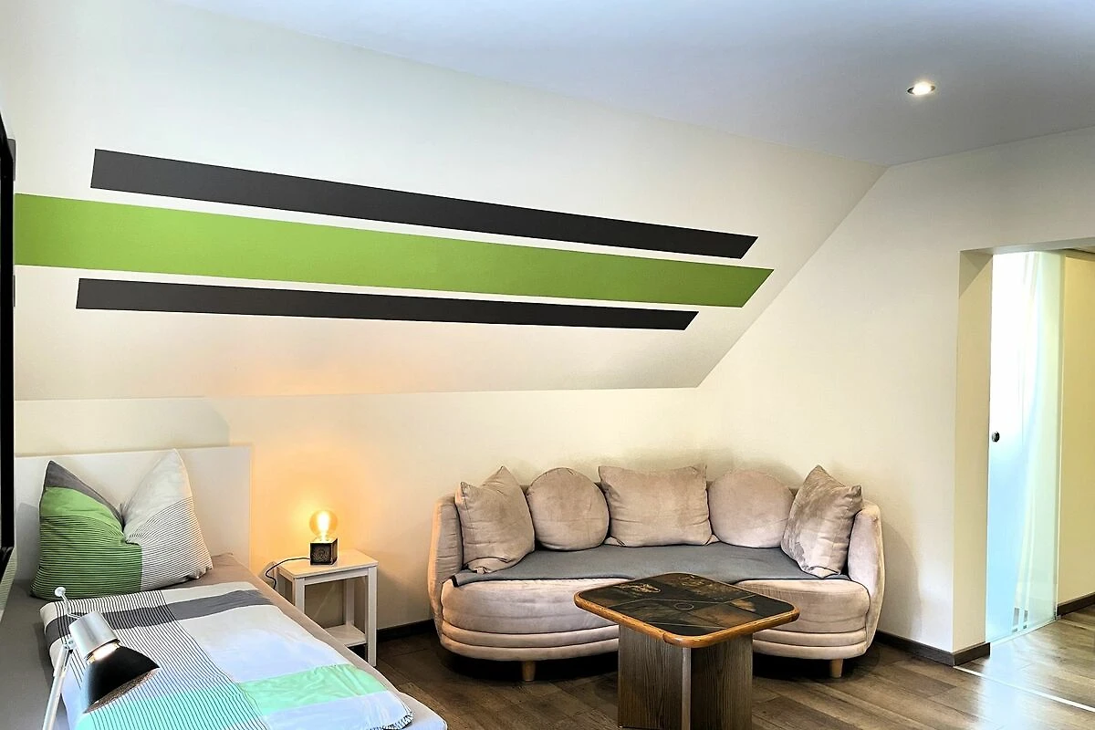 Das Zimmer bietet Platz für bis zu vier Personen und ist mit zwei Einzelbetten sowie einem Doppelbett (1,40 m breit) ausgestattet. Auf Wunsch steht zusätzlich ein Babybett für Kinder bis 3 Jahre bereit. Ein gemütliches Sofa mit Couchtisch lädt zum Entspannen ein, während der Smart-TV für angenehme Unterhaltung sorgt.