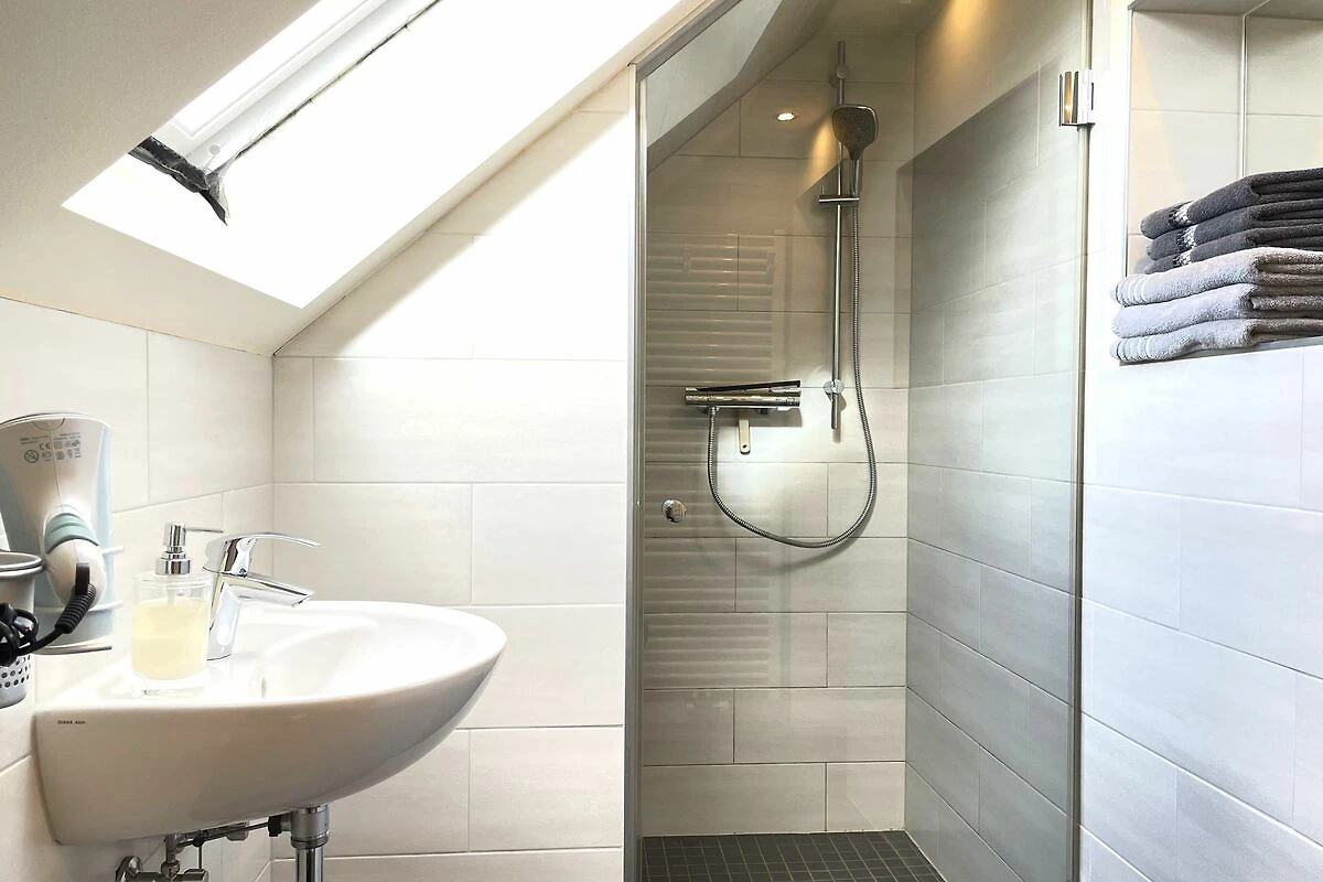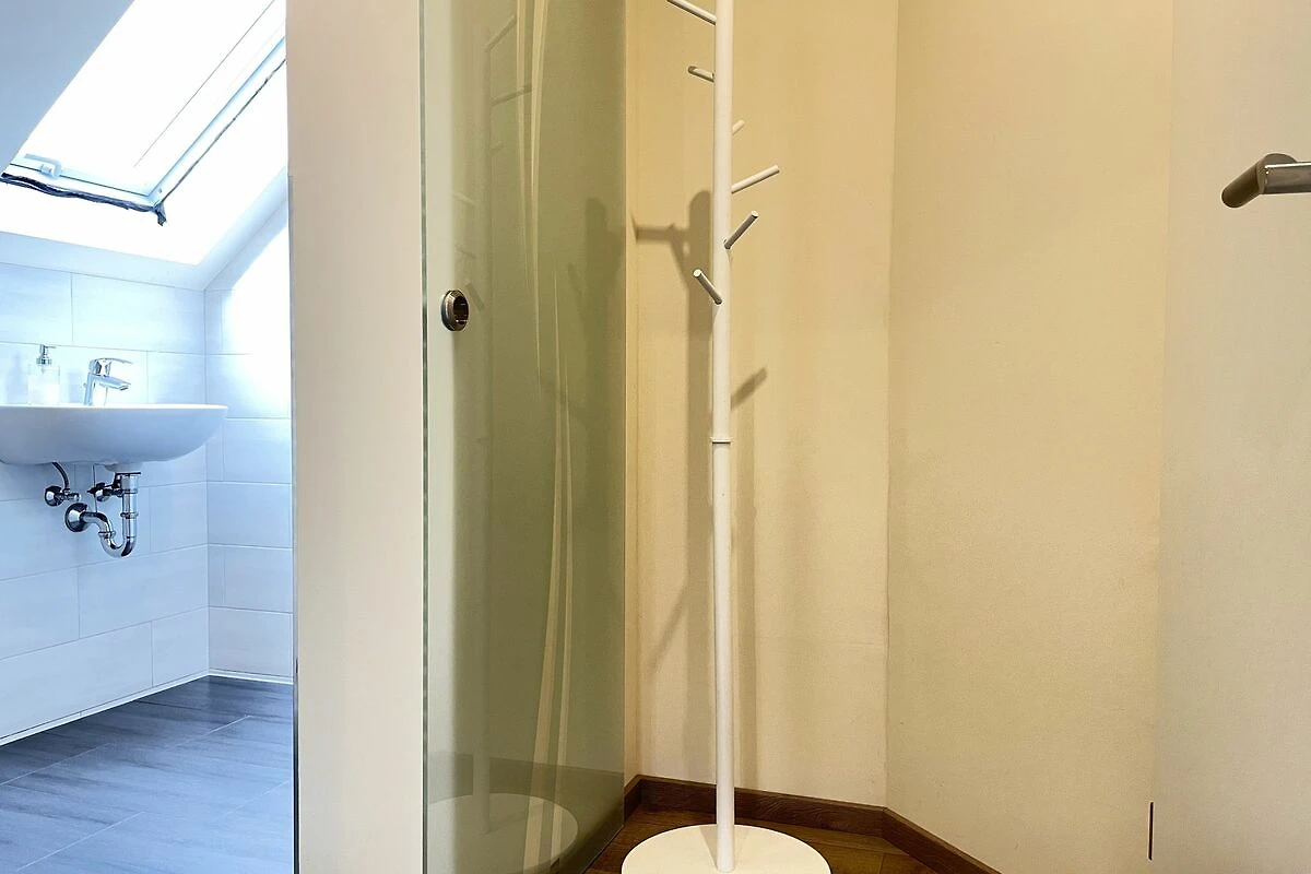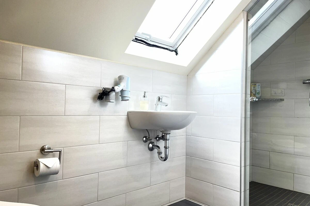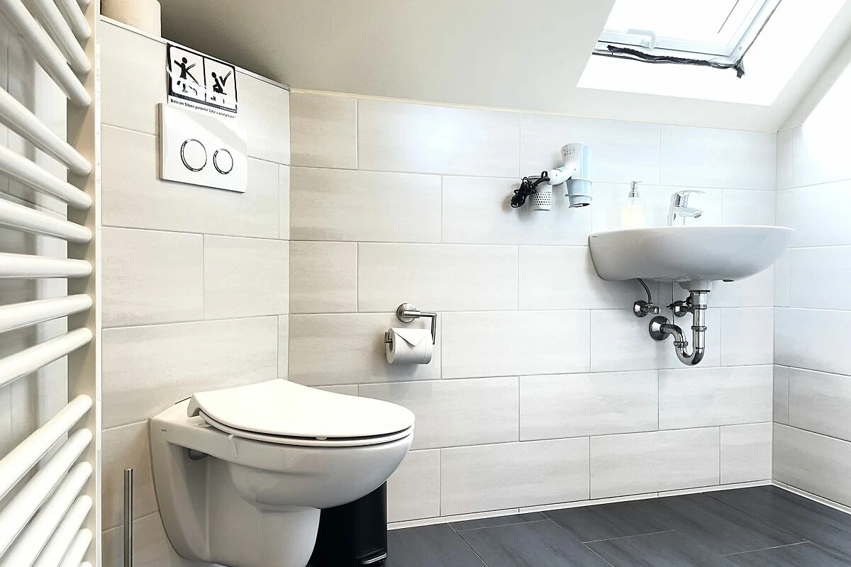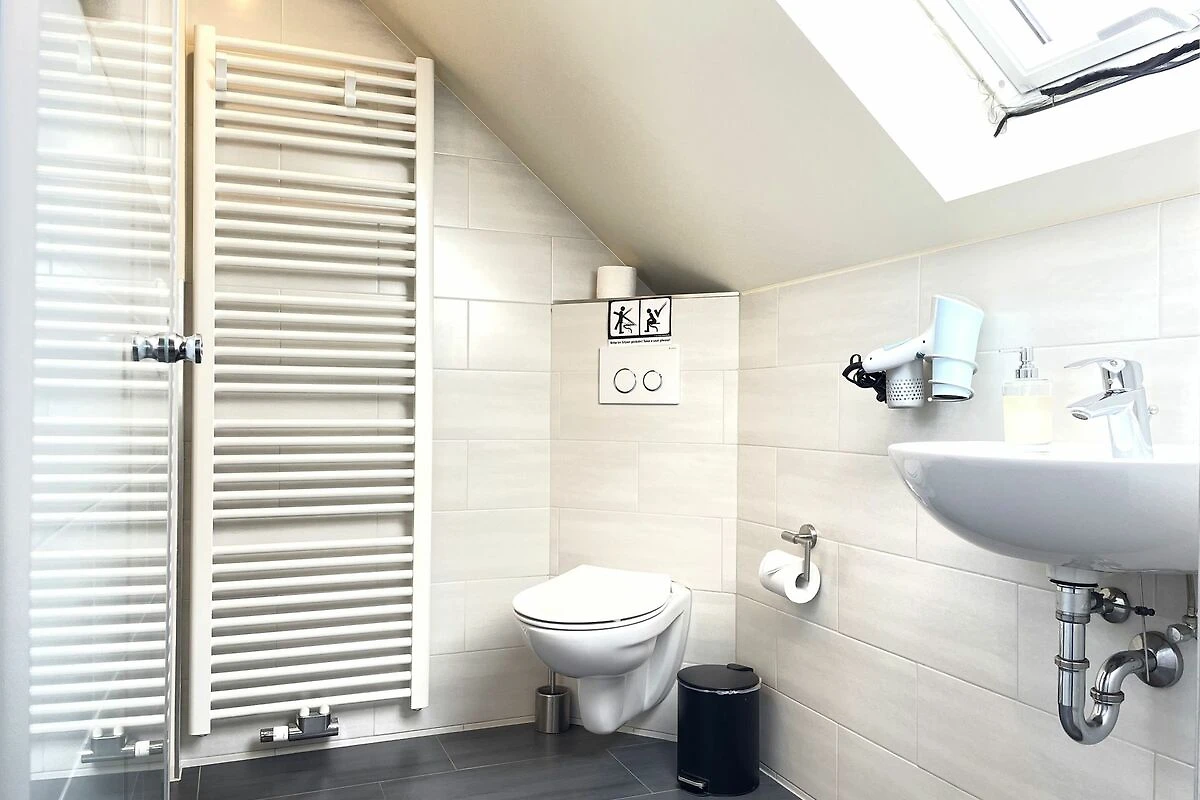 Das moderne Bad mit begehbarer Dusche, Waschbecken und WC wird durch einen praktischen Handtuchwärmer ergänzt ideal für einen komfortablen Start in den Tag.