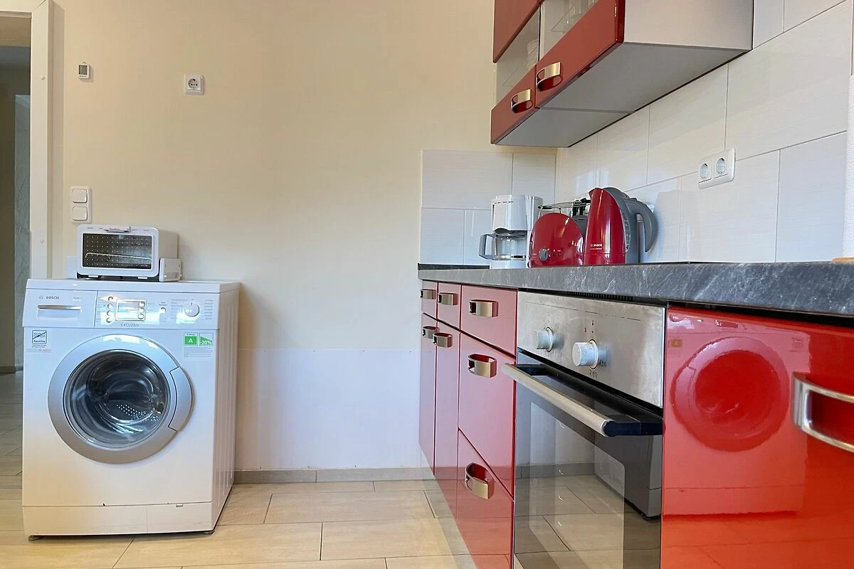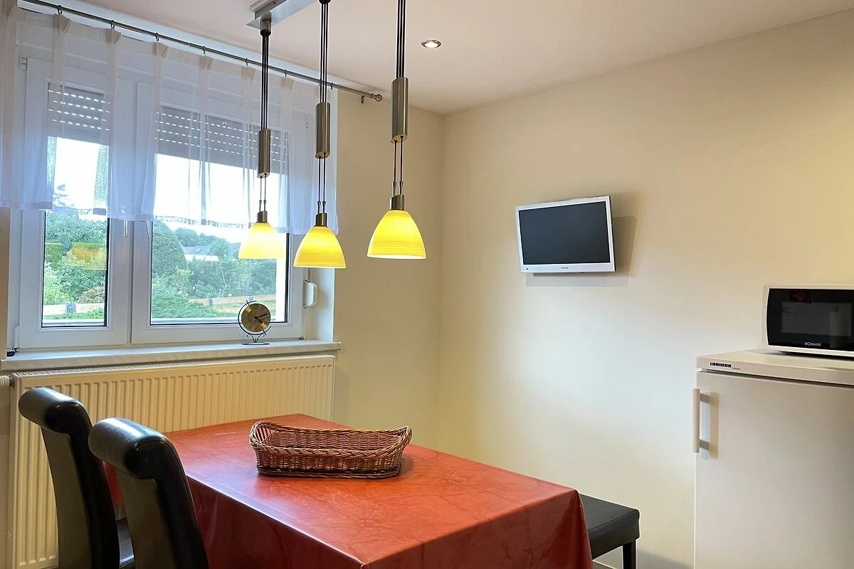 Ein Schreibtisch bietet Platz für kleine Schreibarbeiten oder den Laptop, und die Klimaanlage sorgt auch an warmen Tagen für ein angenehmes Raumklima.