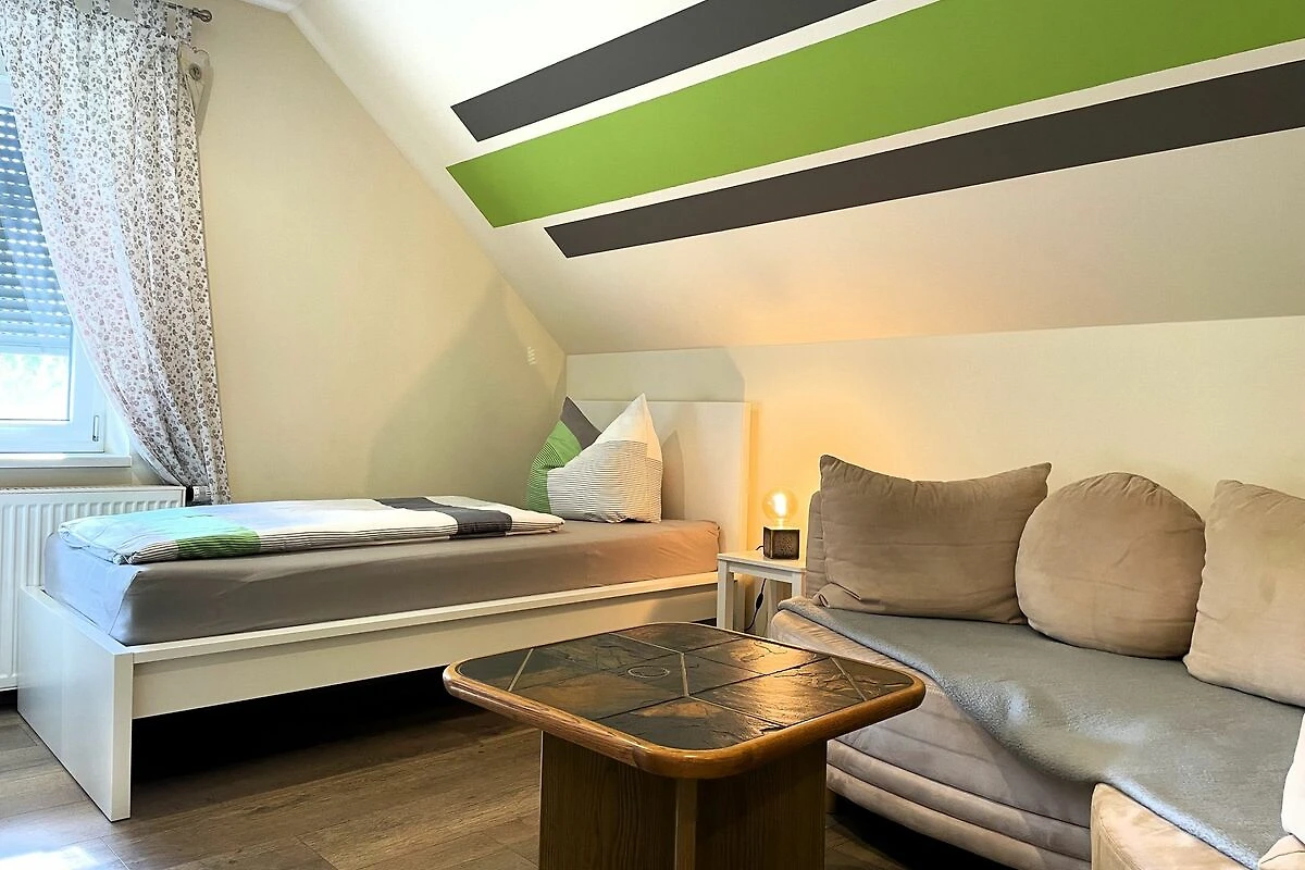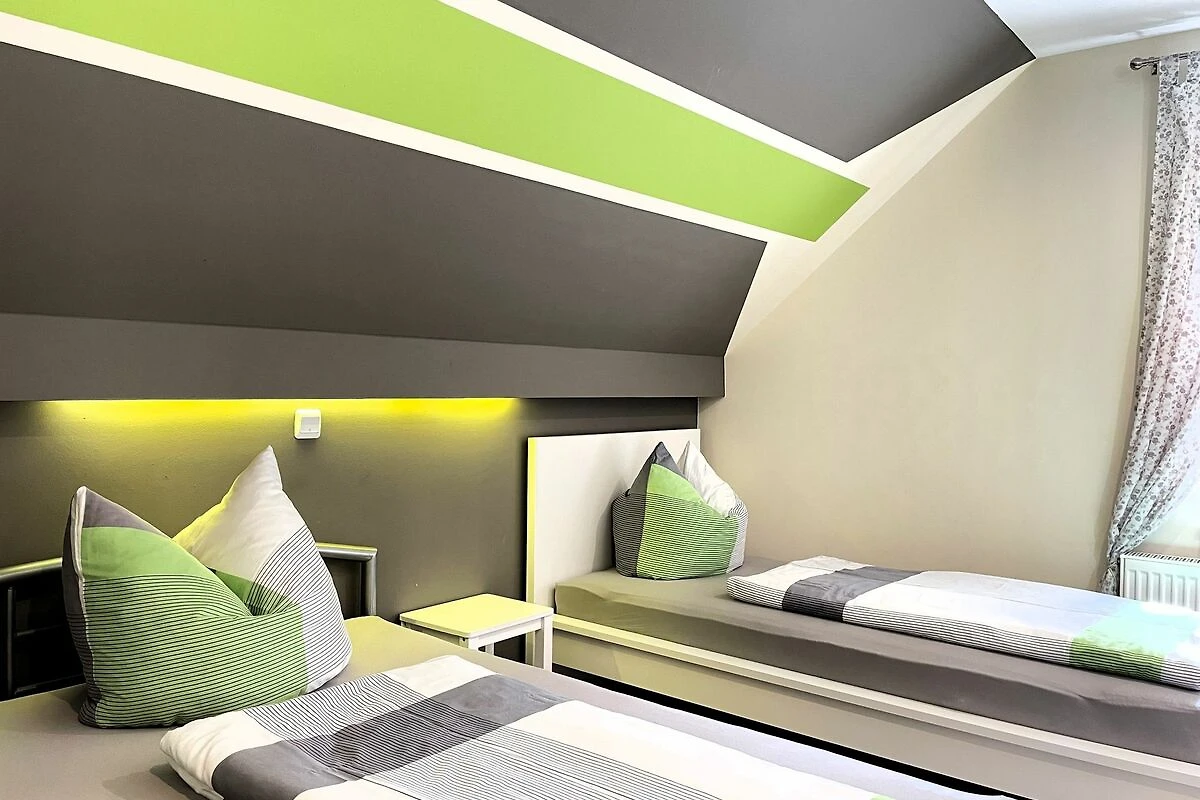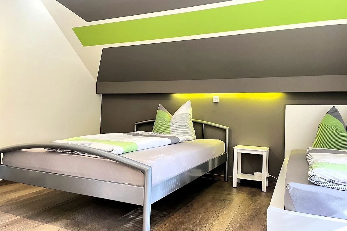 In der oberen Etage erwartet Sie ein grosszügiges, liebevoll eingerichtetes Mehrbettzimmer ein Ort zum Ankommen, Abschalten und Wohlfühlen. Die harmonisch aufeinander abgestimmten Farben und das helle, freundliche Ambiente schaffen eine behagliche Atmosphäre, in der sich Familien, Paare oder kleine Gruppen sofort zuhause fühlen.