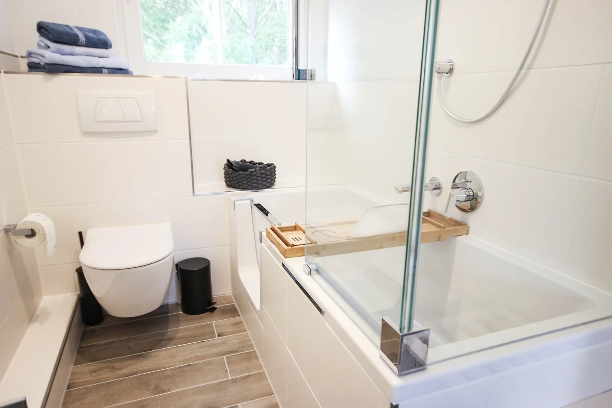 Das Bad mit einer Duchbadewanne, die über eine Tür verfügt, lassen sich Schaumbäder und Duschvergnügen vereinigen.