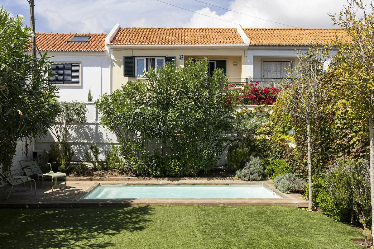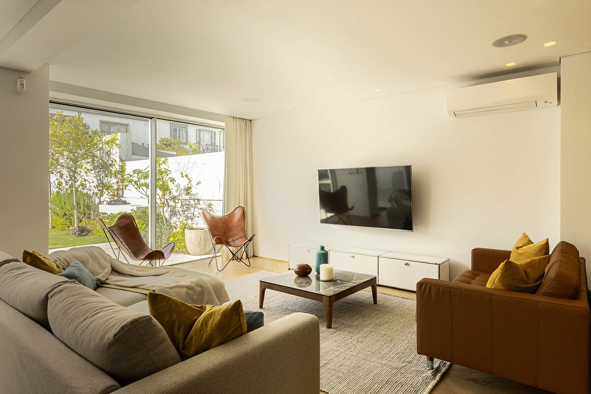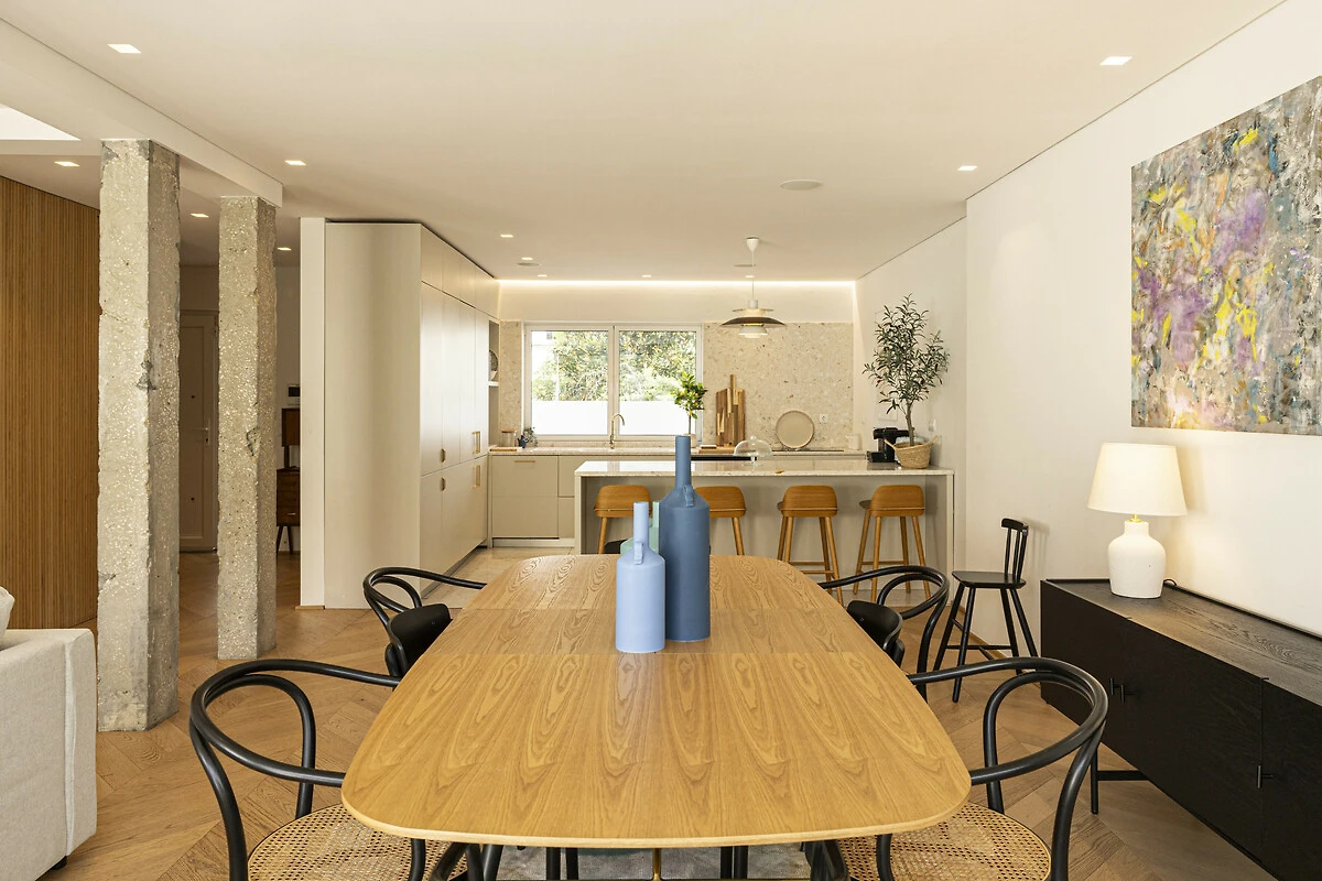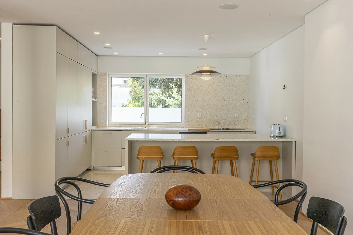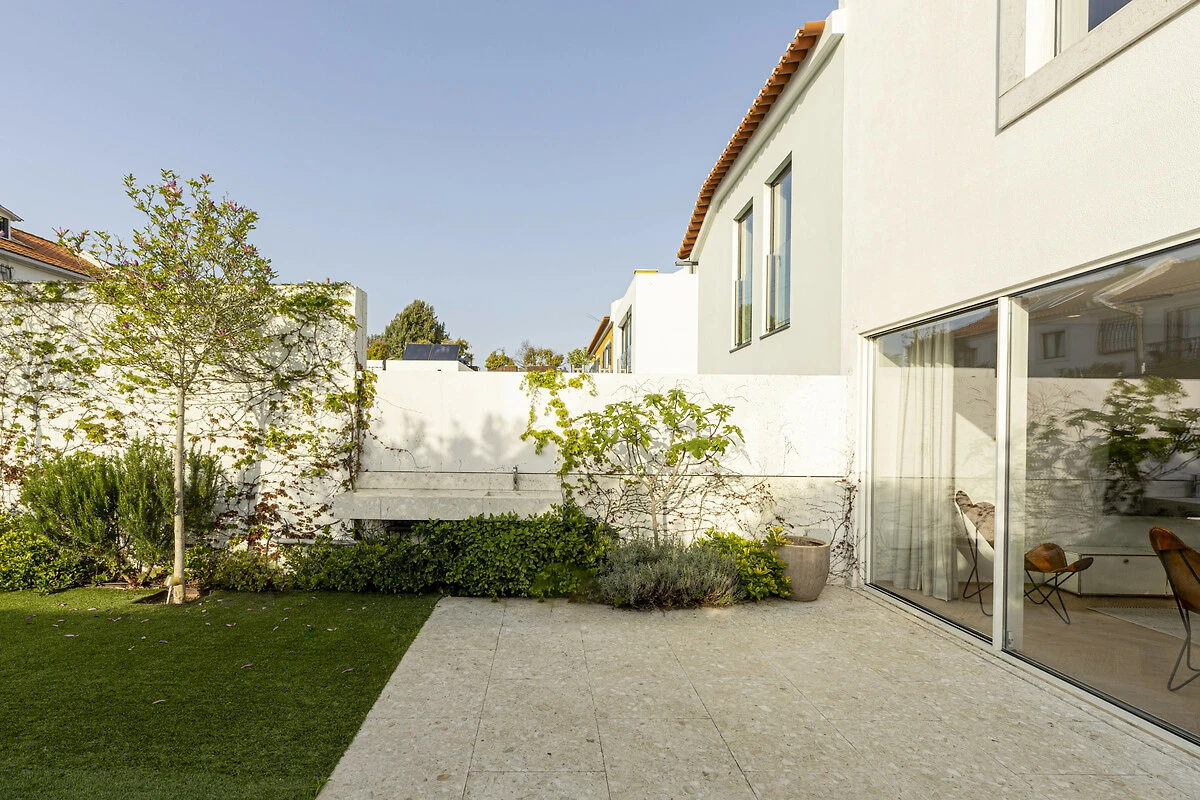 Im Erdgeschoss befindet sich ein grosszügiger offener Wohn- und Essbereich mit zeitgenössischem minimalistischem Innendesign, einschliesslich freiliegender Betonpfeiler und viel natürlichem Holz. Die elegante Marmorküche mit goldenen Designelementen geht nahtlos in den Essbereich über, sodass das Gastgeben von Abendessen und die Beaufsichtigung von Kindern problemlos möglich sind. Der Wohnbereich öffnet sich zu einem geräumigen Garten mit üppigen Bäumen und Blattwerk, der eine private Rückzugsmöglichkeit schafft, während er sich gleichzeitig in der Stadt Lissabon befindet.