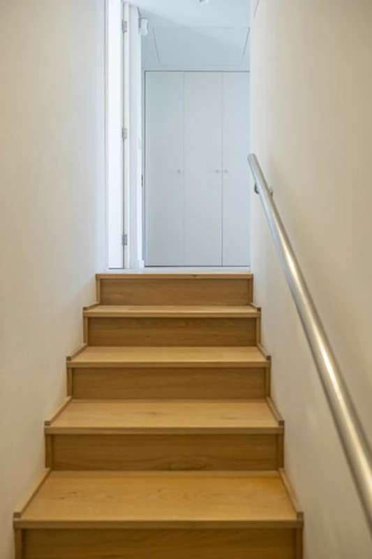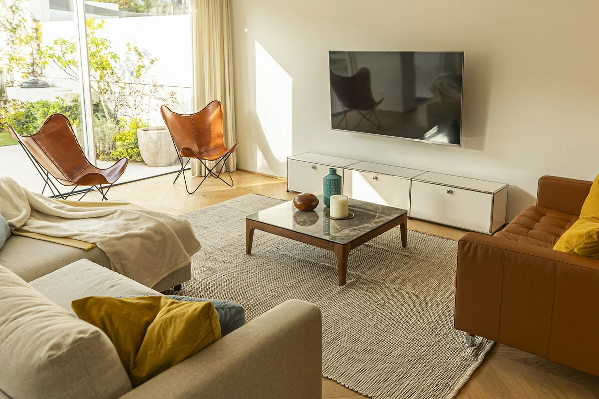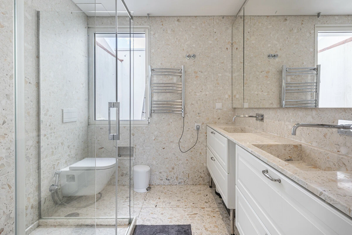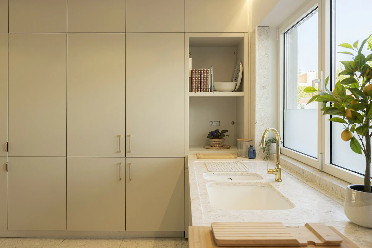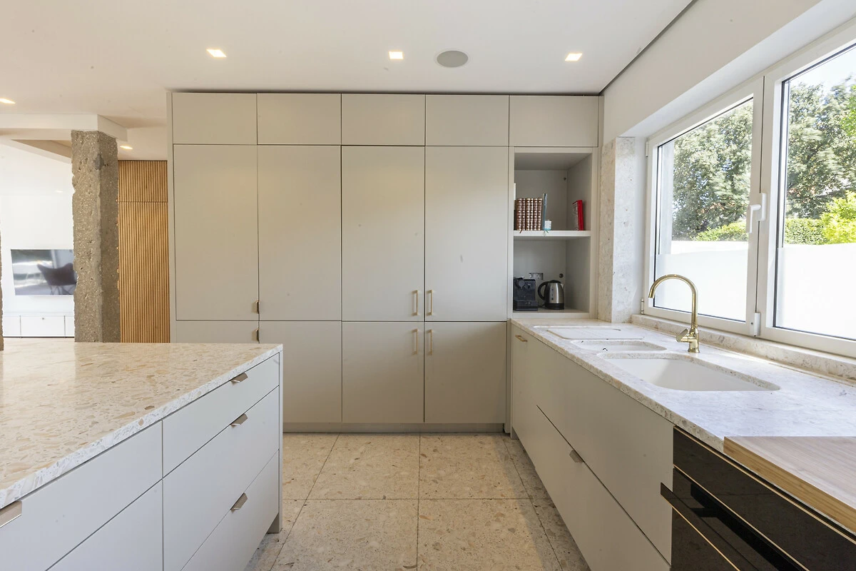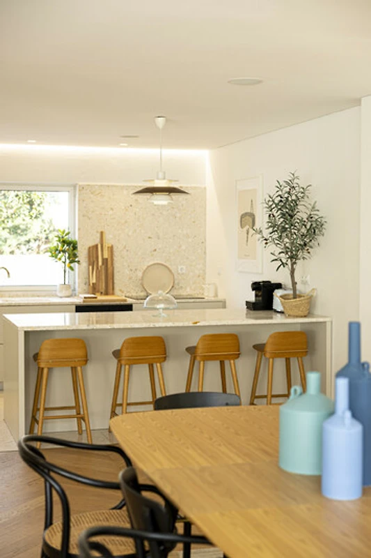 Im Erdgeschoss befindet sich ein grosszügiger offener Wohn- und Essbereich mit zeitgenössischem minimalistischem Innendesign, einschliesslich freiliegender Betonpfeiler und viel natürlichem Holz. Die elegante Marmorküche mit goldenen Designelementen geht nahtlos in den Essbereich über, sodass das Gastgeben von Abendessen und die Beaufsichtigung von Kindern problemlos möglich sind. Der Wohnbereich öffnet sich zu einem geräumigen Garten mit üppigen Bäumen und Blattwerk, der eine private Rückzugsmöglichkeit schafft, während er sich gleichzeitig in der Stadt Lissabon befindet.