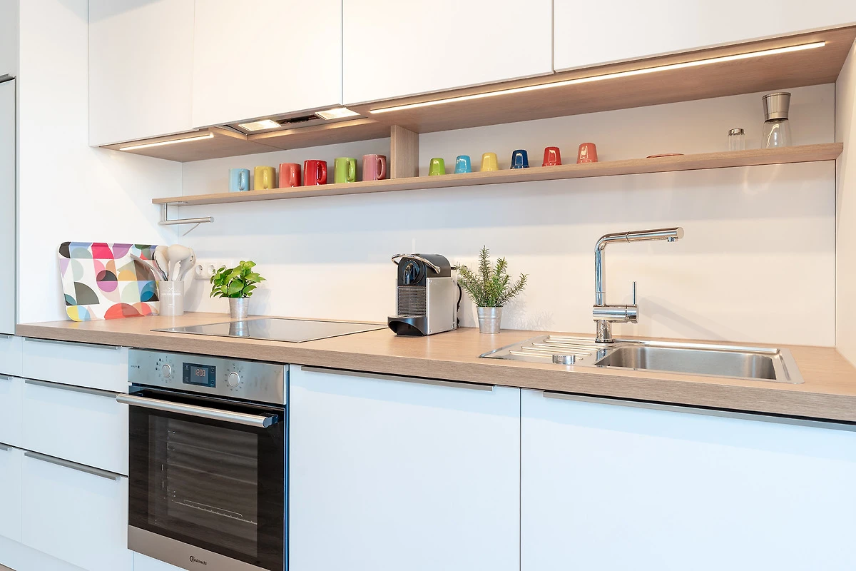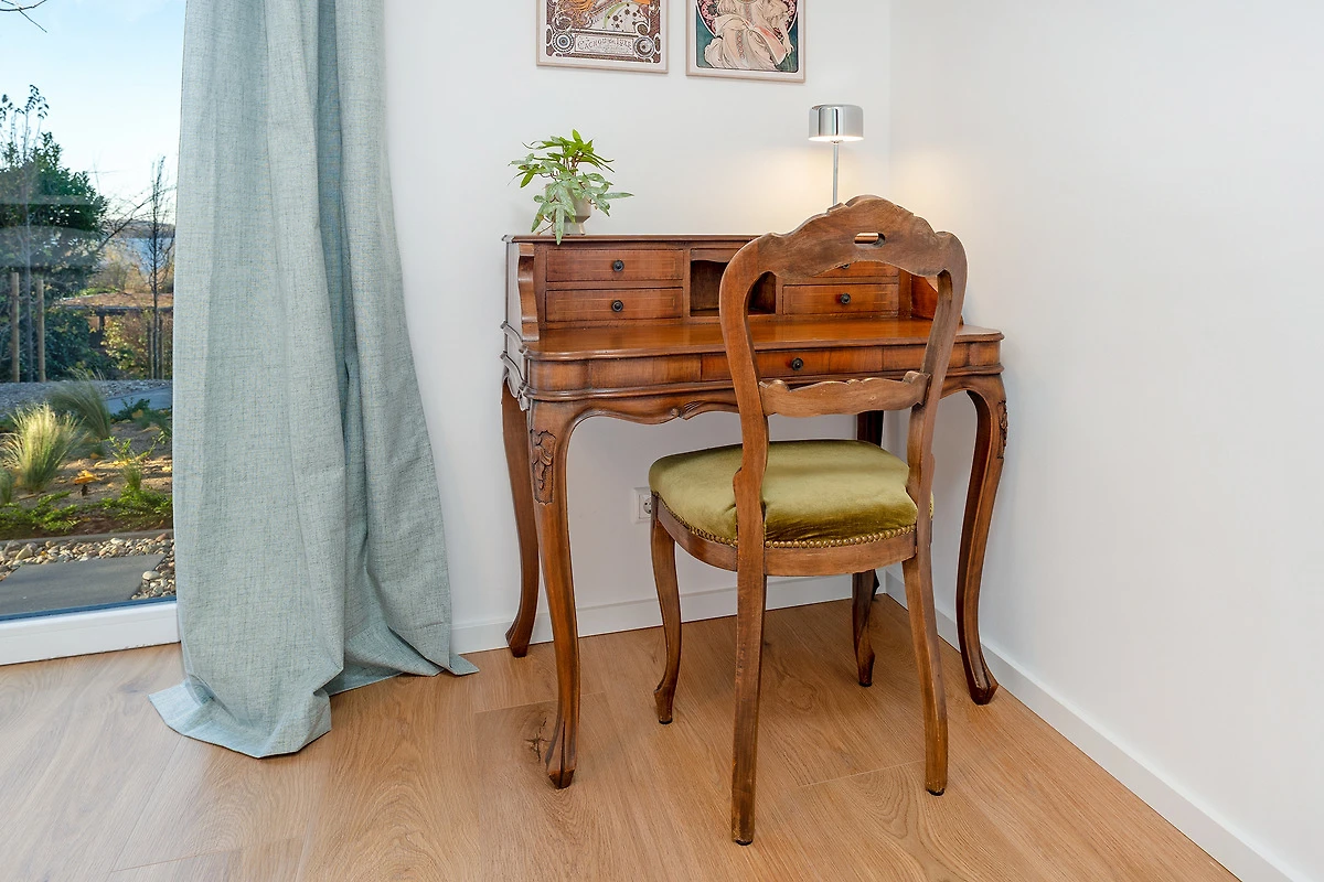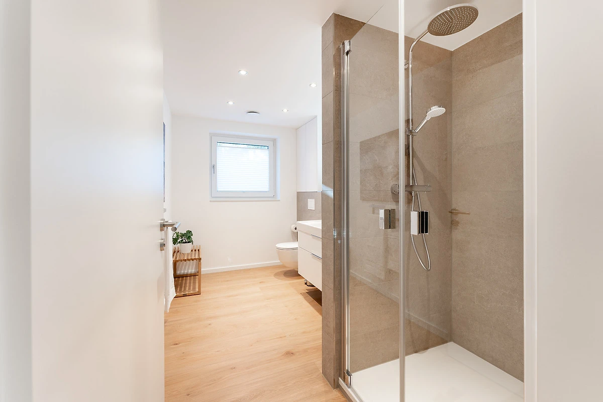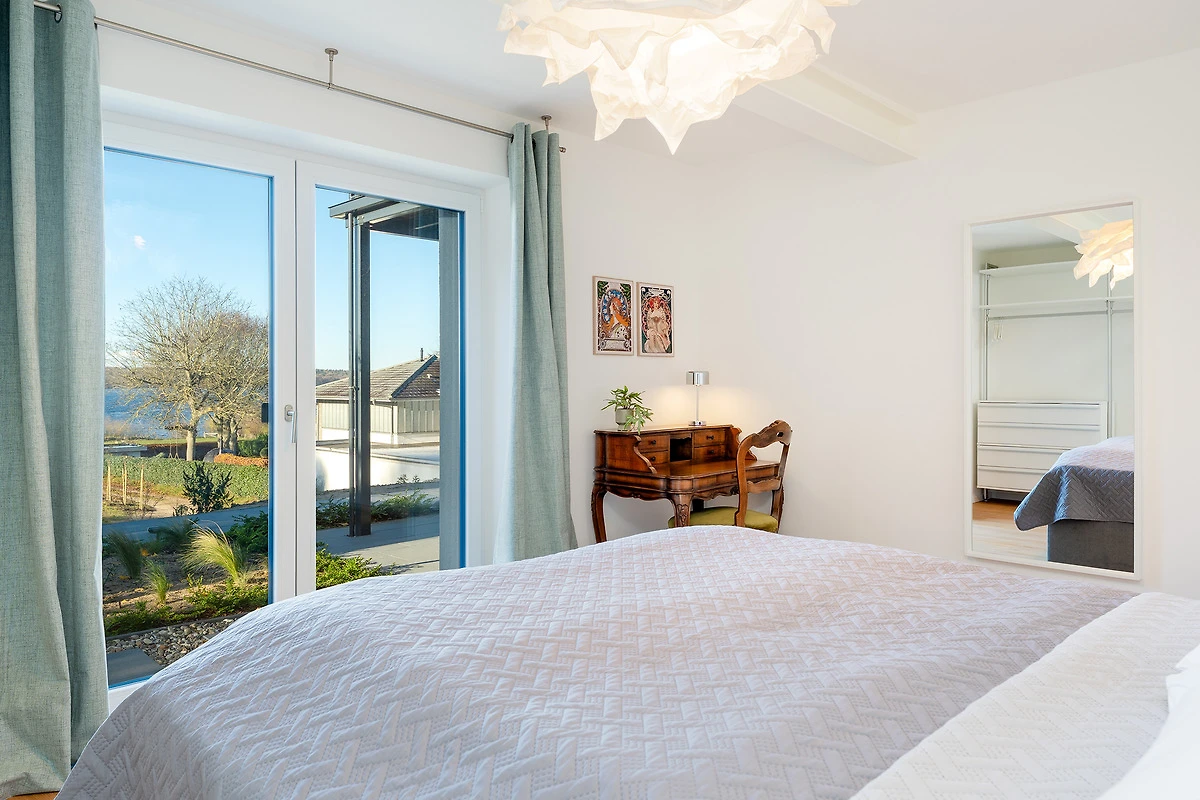 Das Schlafzimmer ist mit einem komfortablen Boxspringbett eingerichtet und bietet viel Stauraum für Ihr Gepäck. Im modernen Tageslicht-Badezimmer erwarten Sie Dusche, WC und Fussbodenheizung. Für die kleinen Gäste stehen auf Wunsch ein Kinderreisebett und ein Hochstuhl bereit.