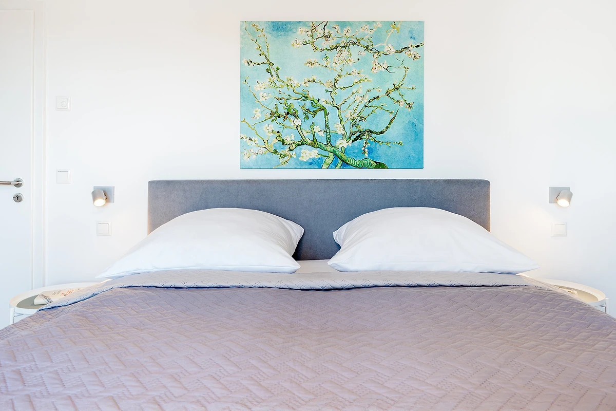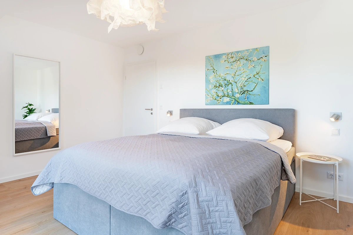 Schlafzimmer: 1 Boxspring-Doppelbett mit durchgehendem Topper (2 x 90 x 200 cm), Kleiderschrank, Verdunkelung: Vorhang, Platz für ein Babybett vorhanden