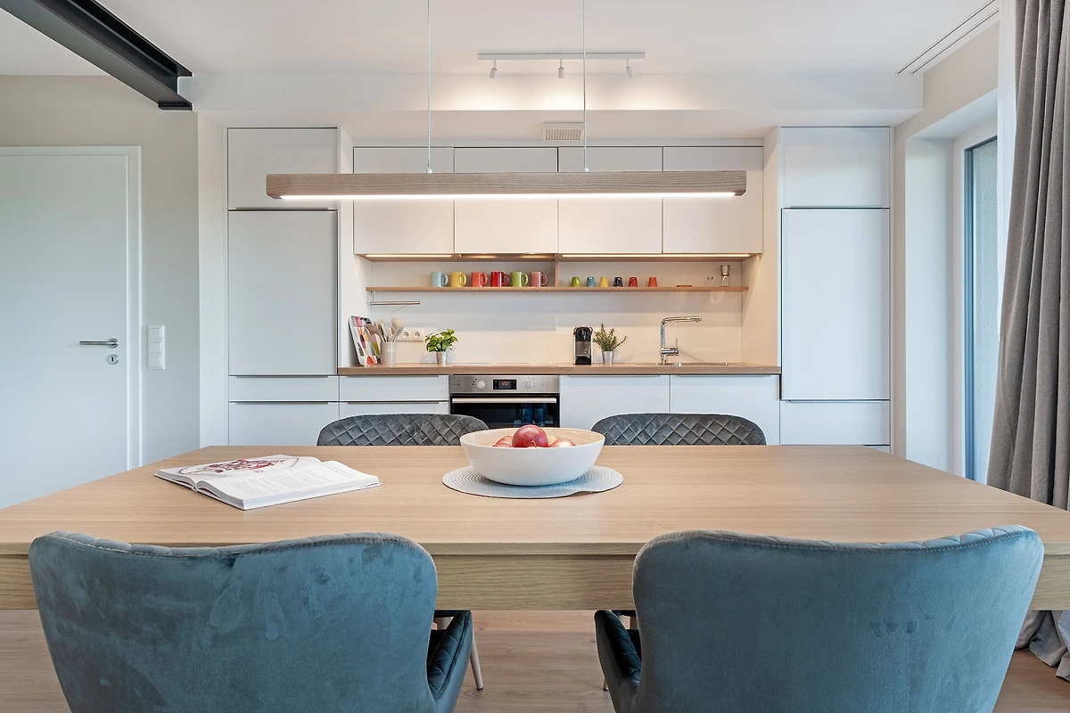 Der helle Wohnbereich lädt mit gemütlicher Sitzecke, Fernseher und Schlafsofa zum Entspannen ein. Von hier aus gelangen Sie direkt auf die überdachte Terrasse, die nach Westen ausgerichtet ist und zu sonnigen Stunden im Freien einlädt. Die angrenzende Küchen ist mit Backofen, Ceran-Kochfeld, Kühlschrank, Mikrowelle und Filterkaffeemaschine voll ausgestattet. Am Esstisch findet die ganze Familie Platz für gemeinsame Mahlzeiten.