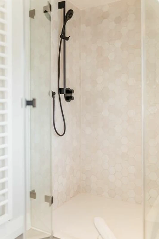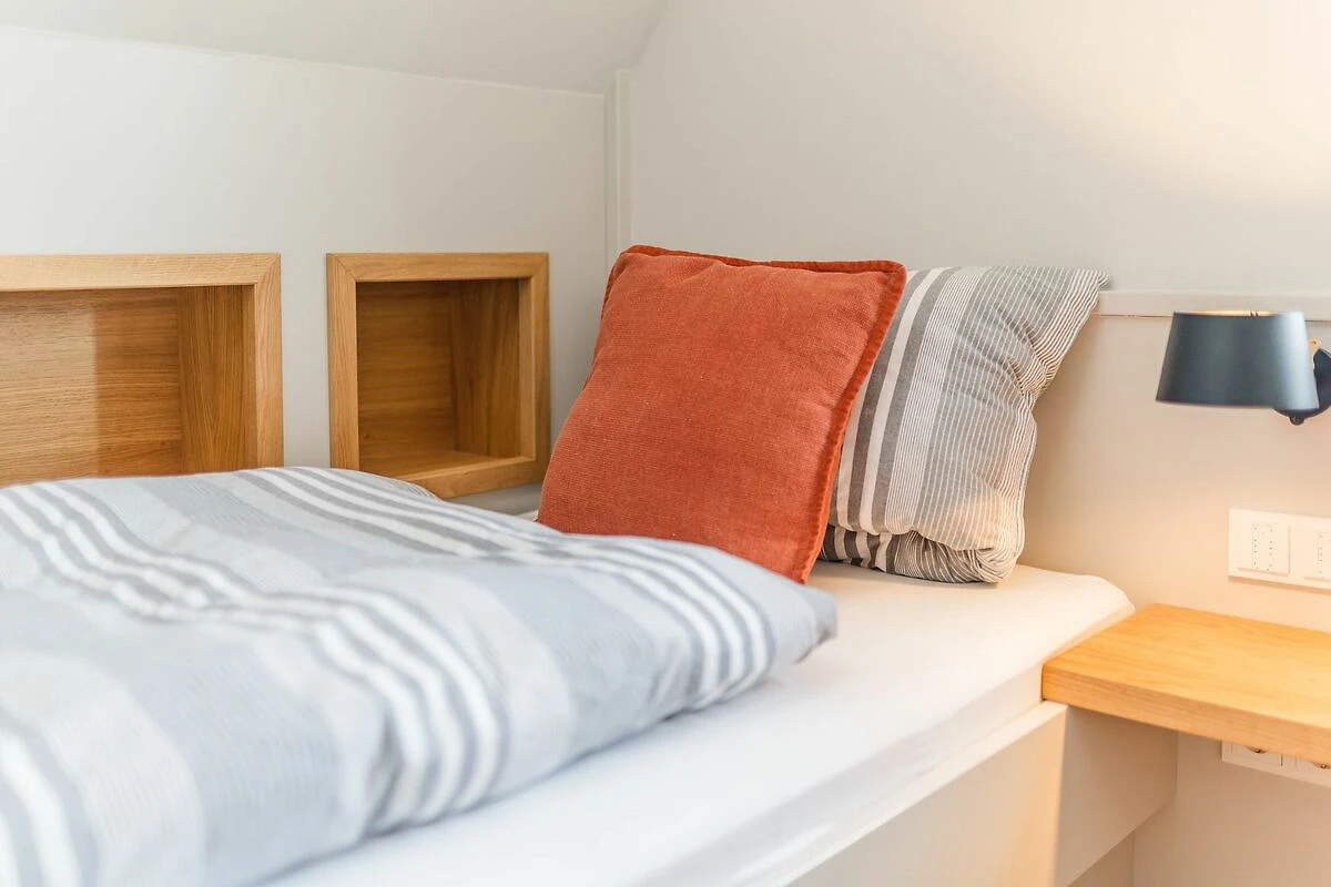 Im Obergeschoss sind die beiden Schlafzimmer - eines mit Doppelbett und eines mit zwei Einzelbeteten - und die beiden Duschbäder - eines davon en Suite - gelegen. Das Doppelbett-Schlafzimmer bietet Ihnen einen schönen Ausblick auf die Alkersumer Marschlandschaft.