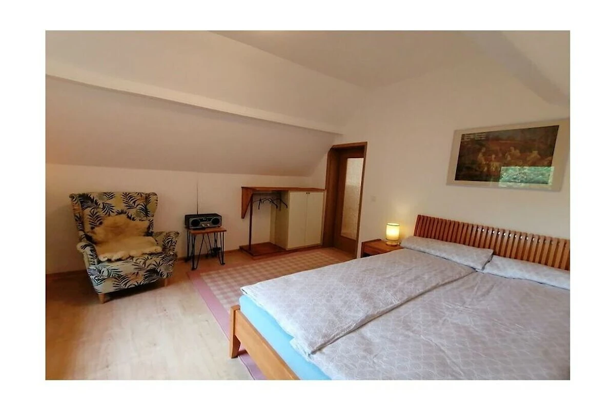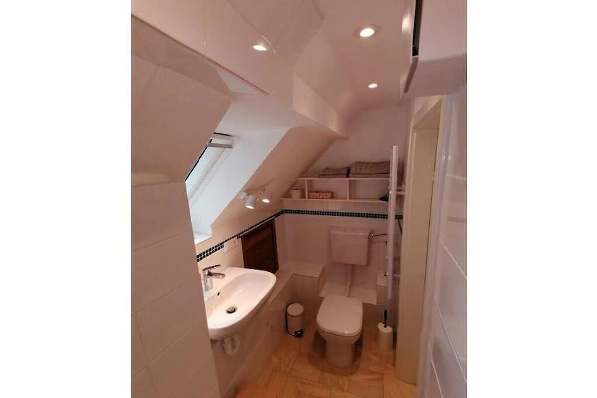 Dachgeschoss: (Wohn-/Schlafzimmer(, , , , , Bibliothek, Doppelbett, DVD-Spieler, Radio, Stereoanlage, Babybett, Fliegenfenster), Badezimmer(, , Toilette, Dusche, Waschbecken, Föhn))