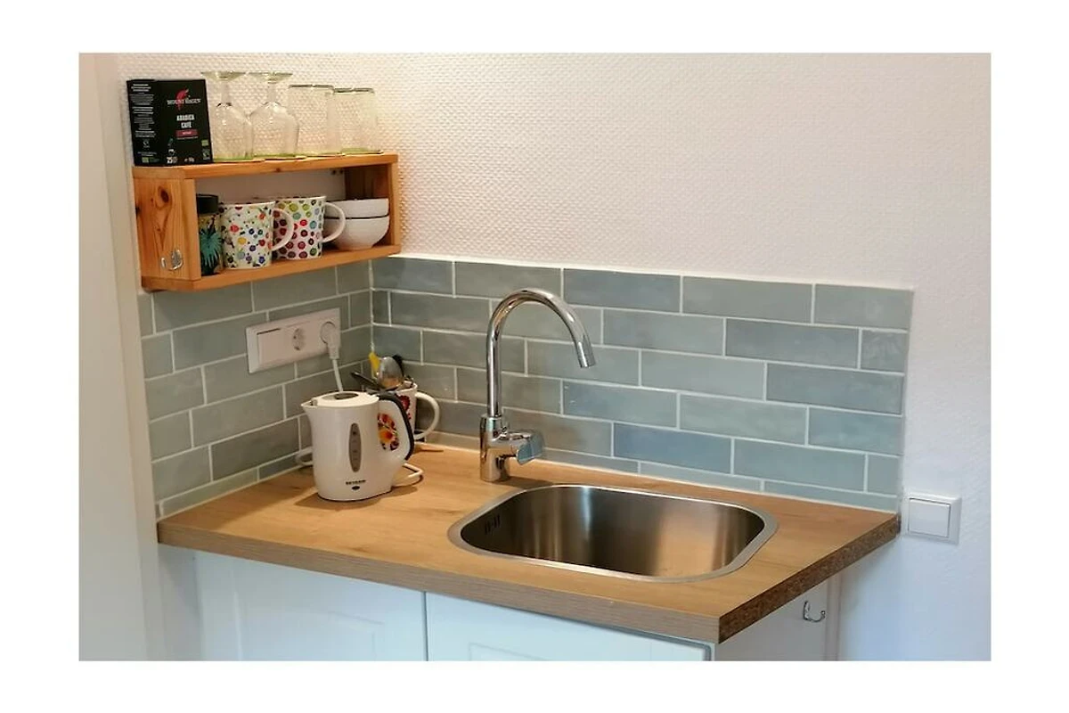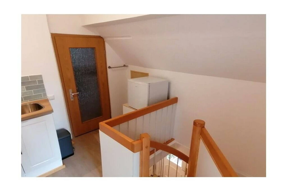 Apartment, 37m² im Grünen Berlin, im Dachgeschoß mit Dachterrasse, Teeküche mit Minikühlschrank im Dachgeschoss, Duschbad, Wohn- Schlafzimmer. Küche mit Vollausstattung im Erdgeschoss, Babybett auf Anfrage. Garten mit Grill und Lagerfeuerplatz. Hollywoodschaukel. Fahrräder und Kanu auf Anfrage.