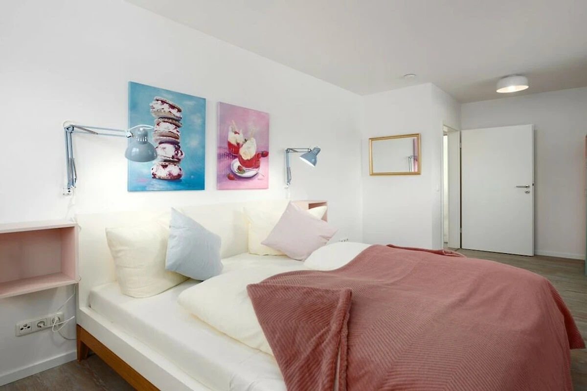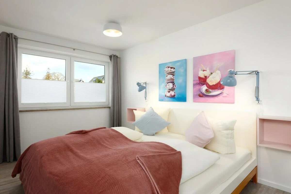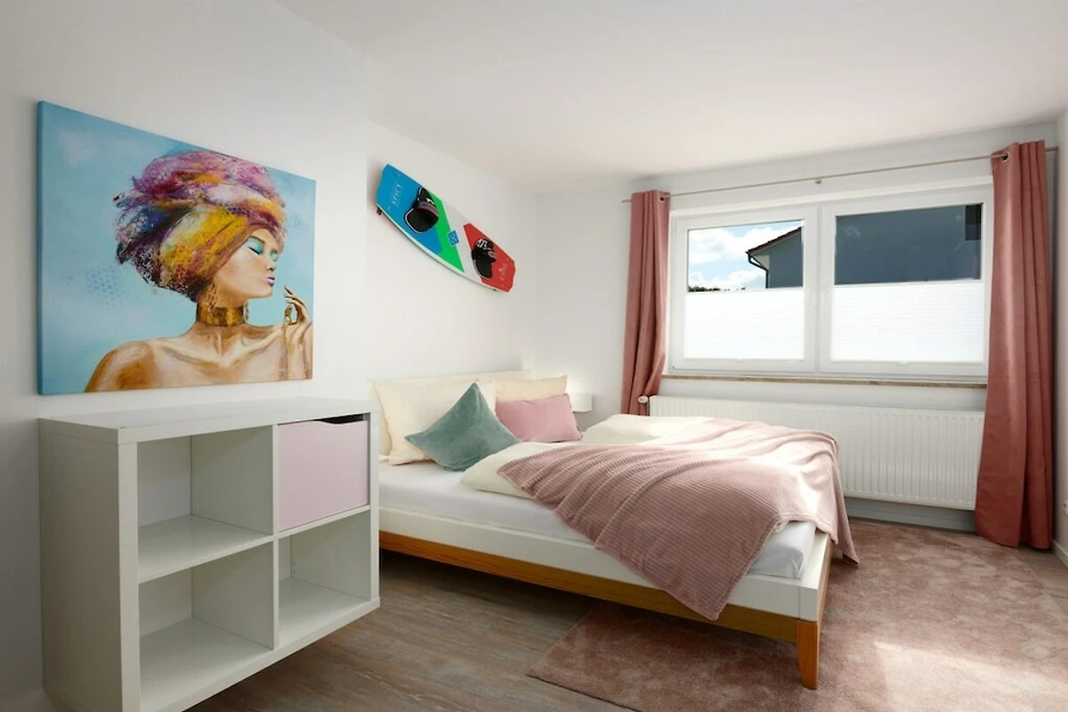 Modernes helles thematisch mit den Bildern der Künstlerin Sabine Körner eingerichtetes neues Art-Partment, geräumig und gemütlich, barrierearm ohne Stufen, 2 Schlafzimmer mit Doppelbetten 180x200, zwei Smart-TV, geräumiges Bad mit ebenerdiger Dusche, großzügiger zentraler Wohn-Essbereich mit hochwertig komplett eingerichteter Einbauküche, gemütliches Wohnzimmer mit direkten Zugang zur möblierten Terrasse u.a. mit Strandkorb, Privatparkplatz direkt am Haus, Hauswirtschaftsraum mit Waschmaschine, Trockner, Staubsauger, Wäscheständer, Putzutensilien.