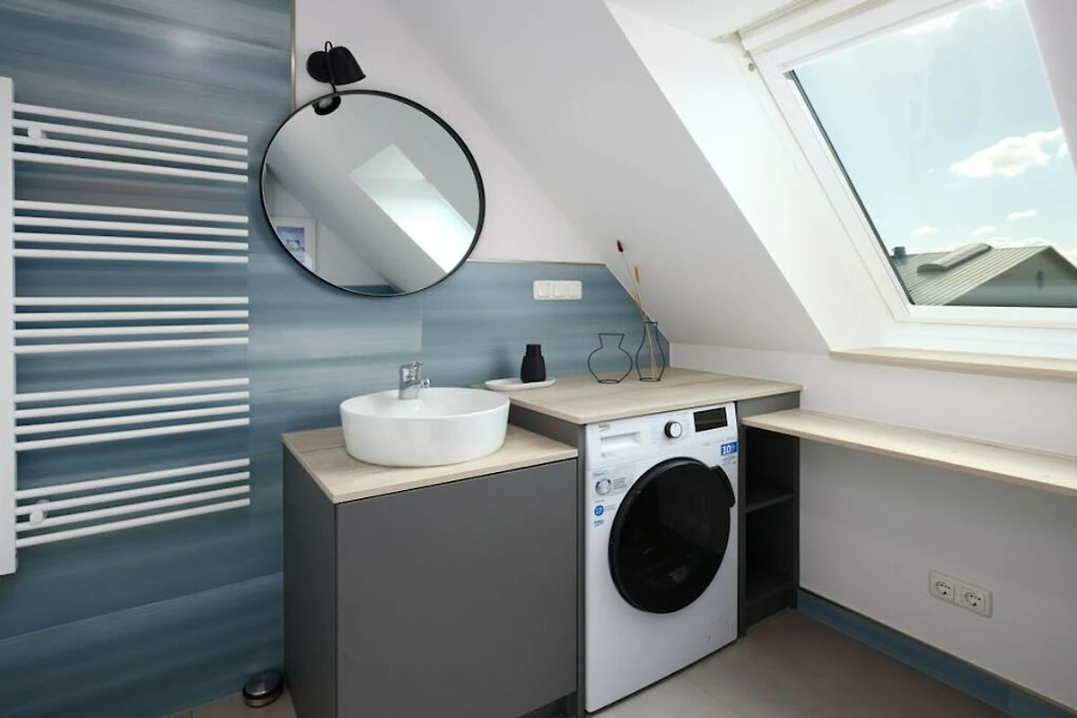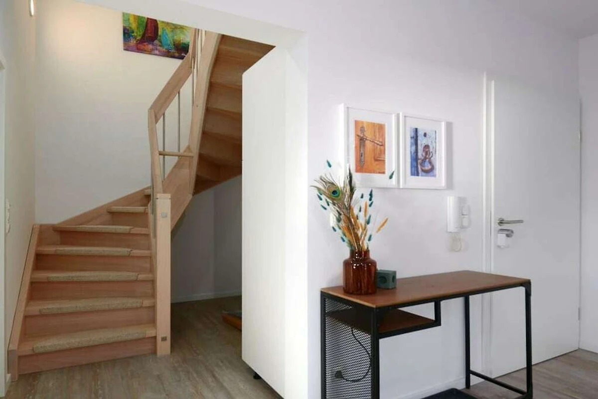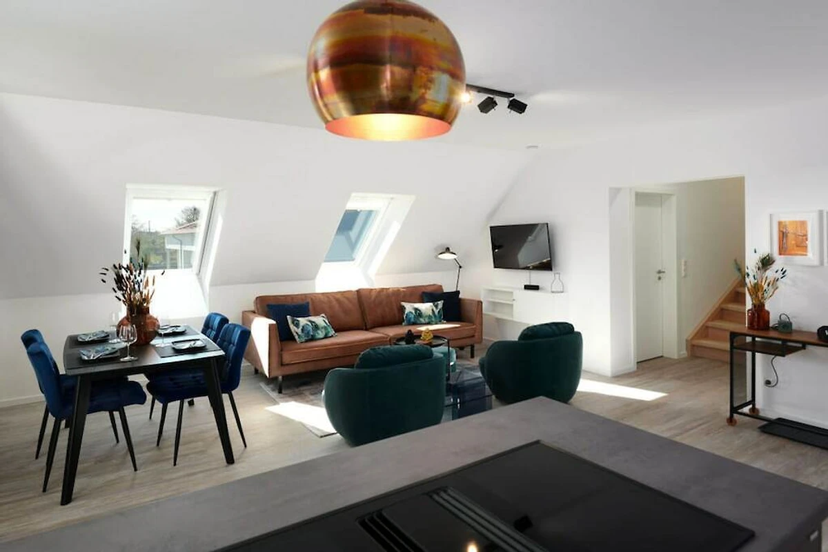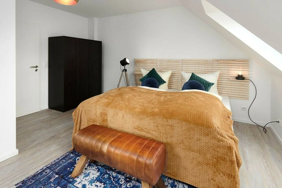 Peppig eingerichtetes Maisonette Art-Partment, aufgeteilt in einen unteren Wohnbereich und einen oberen Relaxbereich mit eigenem Home-Office Platz, zwei Schlafzimmer mit Doppelbetten 180x200, zwei Smart-TV, Duschbad mit Waschtrockner, zentraler Wohn-Essbereich mit hochwertiger, komplett eingerichteter Einbauküche, Esstisch, gemütliche Sofalandschaft, direkter Zugang zum möblierten Balkon, Privatparkplatz direkt am Haus, im Flur separater Hauswirtschaftsschrank mit Staubsauger, Bügeleisen, Wäscheständer, Feuerlöscher, Putzutensilien.