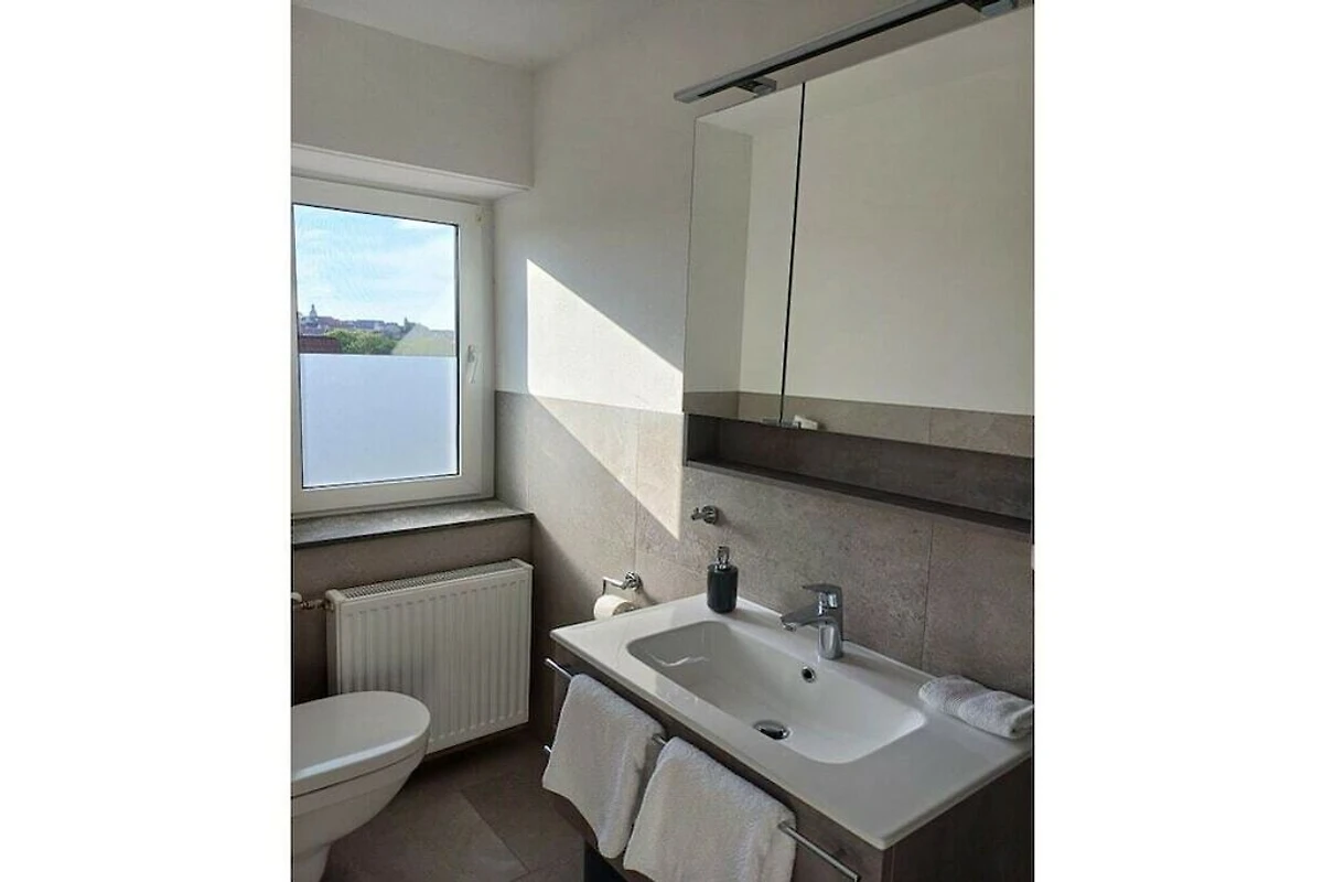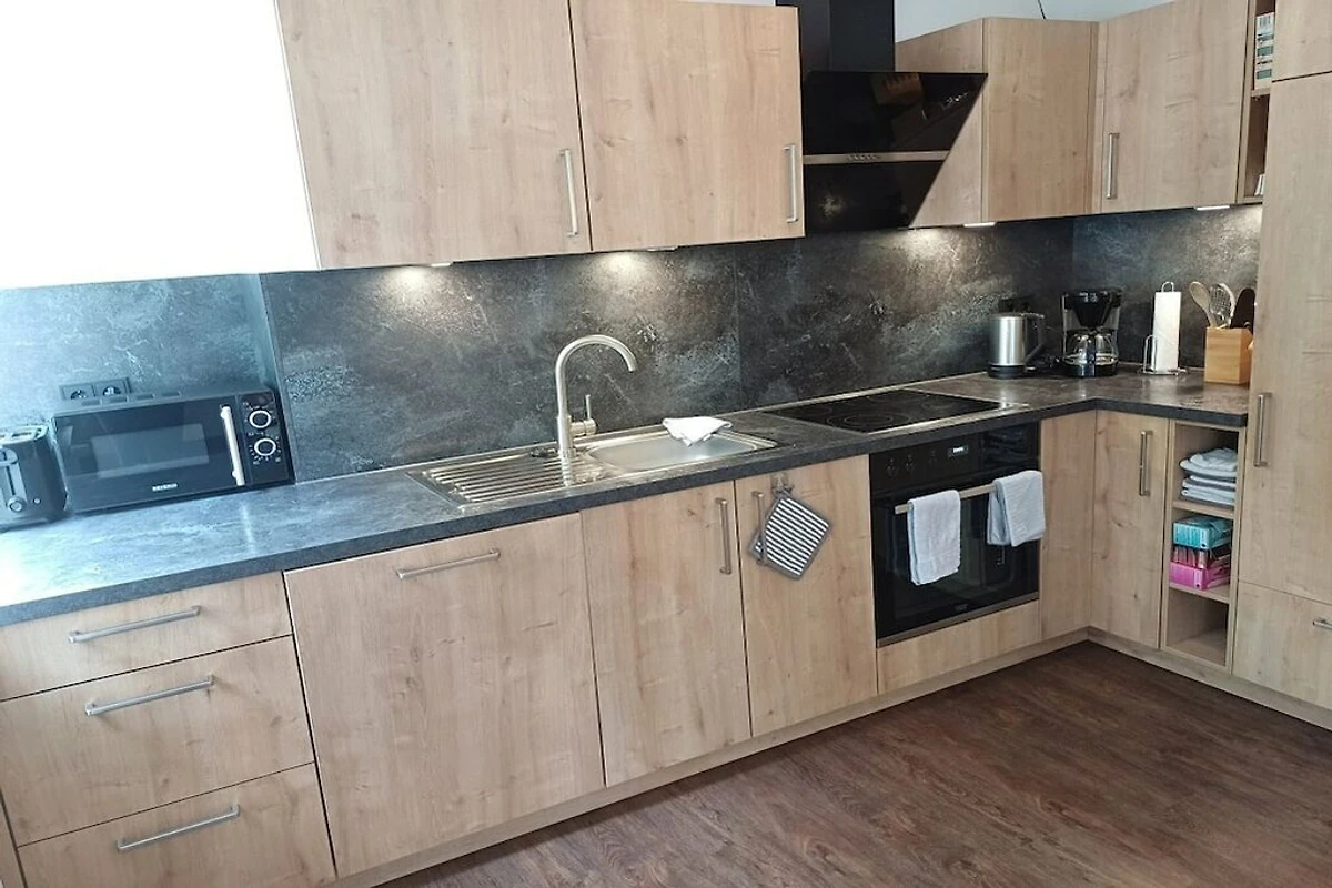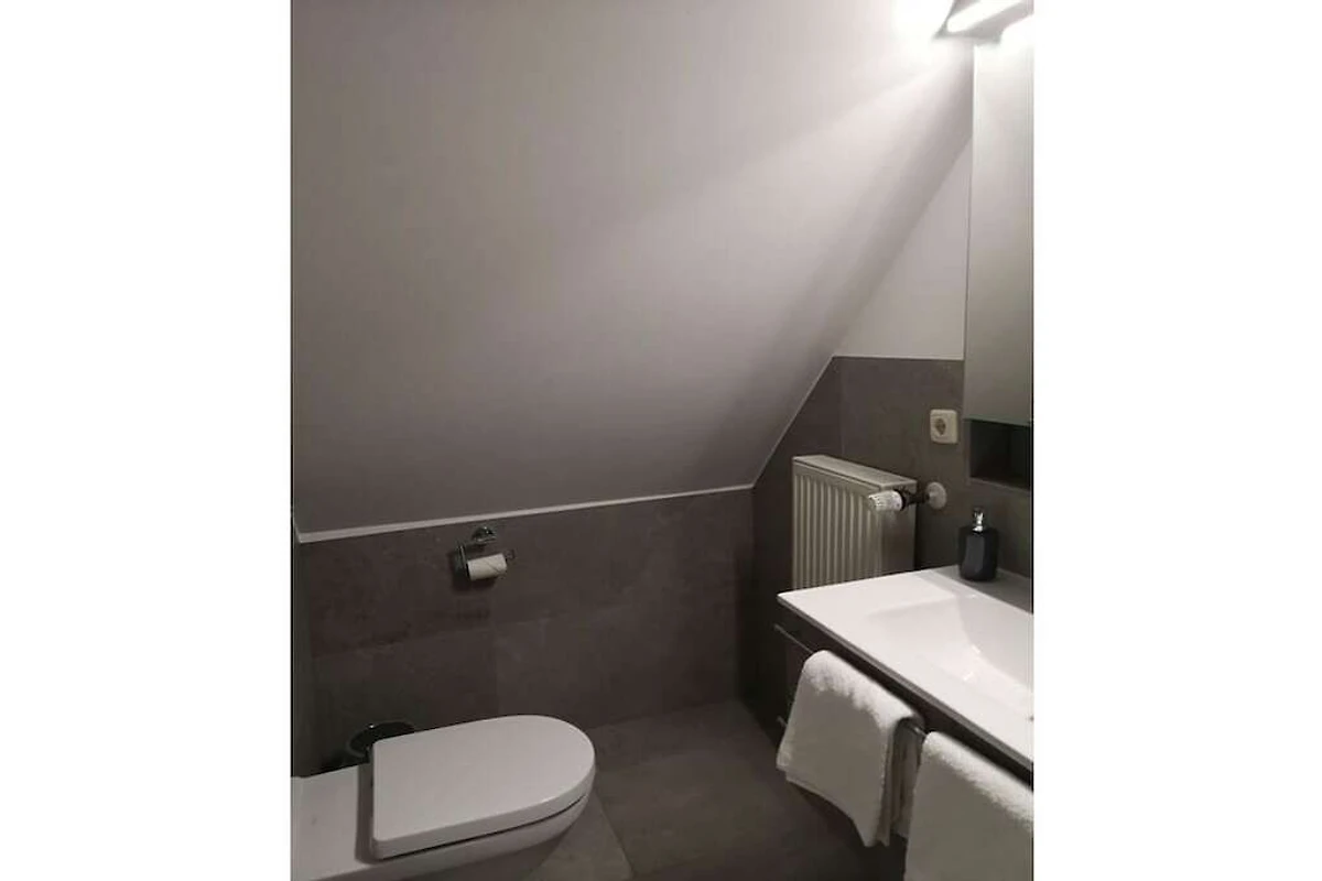 Zu unserer Ferienwohnung für maximal 8 Personen gehören 3 Schlafzimmer, zwei davon mit jeweils einem Schlafsofa, 3 Bäder (mit DU/WC), 1 Gäste-WC, Wohn-/Esszimmer (26 qm), voll ausgestattete Küche, Balkon, Billardzimmer mit Tischfußball sowie Stepper, Heimtrainer und Bauchtrainer im Spitzboden (erreichbar über eine steile Treppe), Gartenhaus mit überdachtem Freisitz, Spielplatz, Liegewiese, Gartengrill und Parkplatz sowie Waschmaschine, Wäschetrockner und Wäscheständer (im Keller).