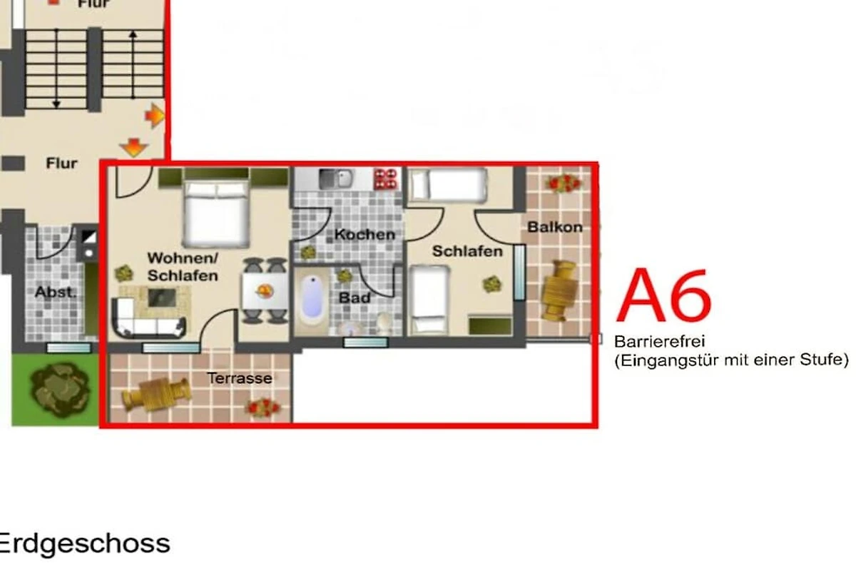 In unserem Apartment A6 befindet sich ein Wohn- und Esszimmer, ein Schlafzimmer, ein vollausgestattet Küche und ein modernes Badezimmer.